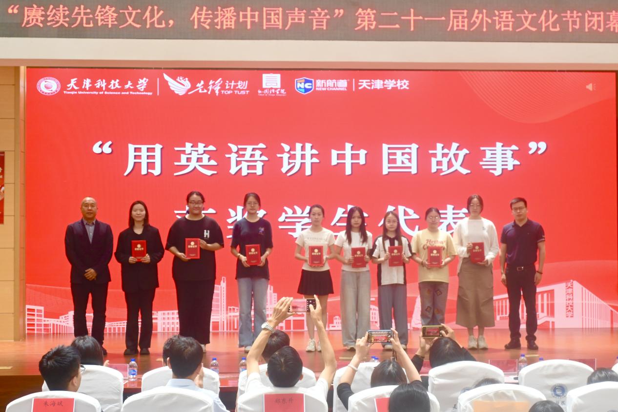 学院领导班子、新航道教育集团天津学校负责人、生态城实验小学副校长及学院相关老师为第二十一届外语文化节获奖学生代表和第五届“用英语讲中国故事”大赛获奖学生代表颁奖。