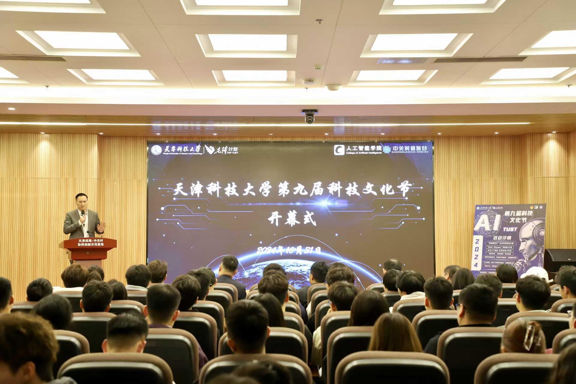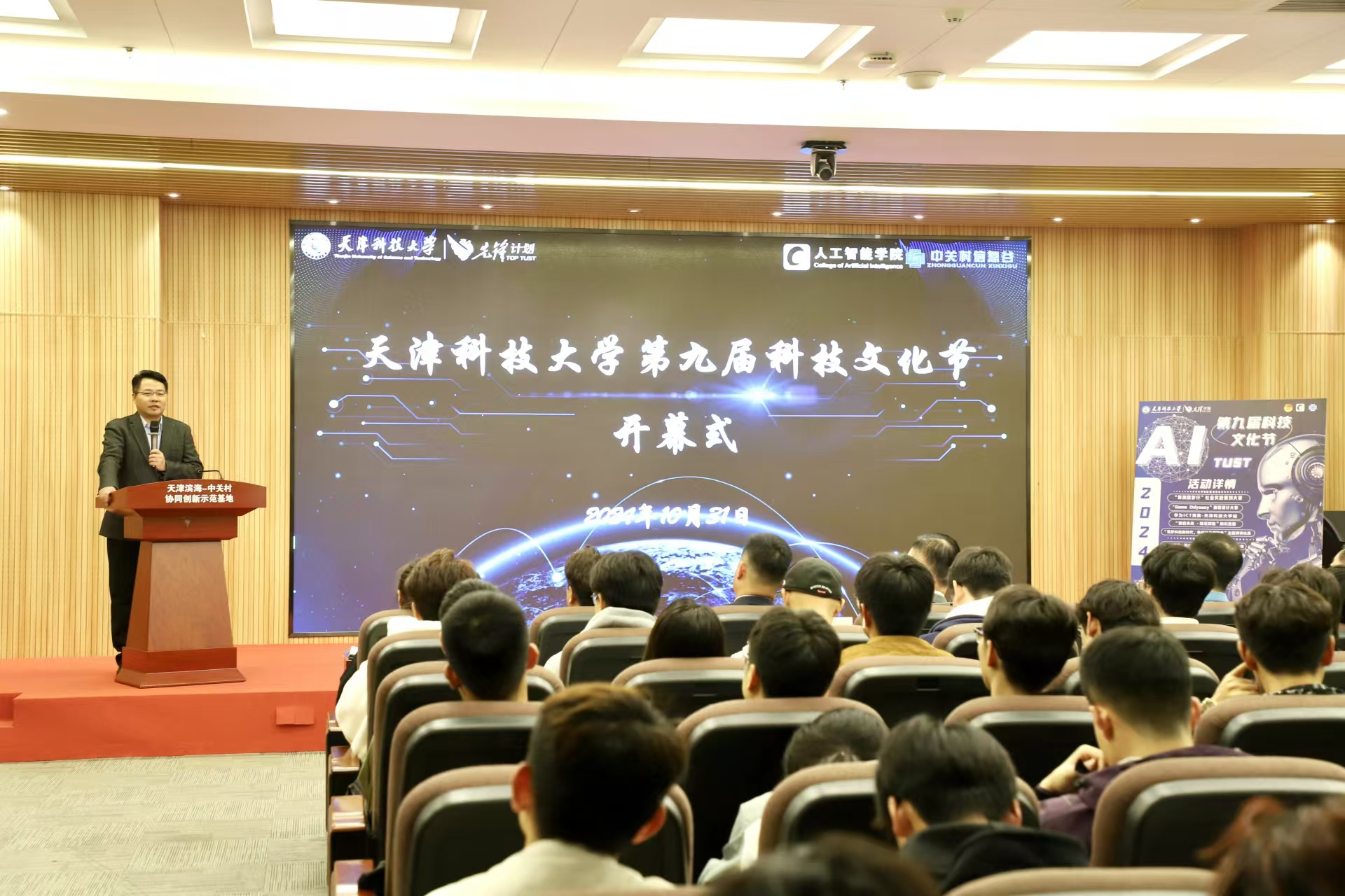 为深入学习贯彻党的二十届三中全会精神,积极落实天津科技大学“先锋计划”要求,2024年10月30日13:00,由校团委、校学工部主办,人工智能学院、天津滨海中关村科技园承办,第九届科技文化节在天津滨海中关村协同创新实践基地盛大开幕,本届科技文化节以“科技引领创新先锋,智慧点亮未来征程”为主题,依托天津滨海中关村科技园,打造多元化、全方位的校企协同平台,促进京津冀区域内的科技创新和成果转化,实现高校与企业在技术研发和创新应用的深度协同。人工智能学院党委书记司占军、北京中关村信息谷资产管理有限责任公司区域总经理、天津中关村科技园运营服务有限公司总经理郑毅、天津中关村科技园运营服务有限公司副总经理黄超群、腾讯智影商业化总监党金、北京智京未来科技有限公司创始人兼CEO王智武、天津中环天元环境检测技术服务有限公司总经理陈会东、天津科技大学团委副书记许丽娜、人工智能学院党委副书记、纪委书记韩静参加开幕式,人工智能学院团委书记兼学生工作办公室主任邓雪晨主持。