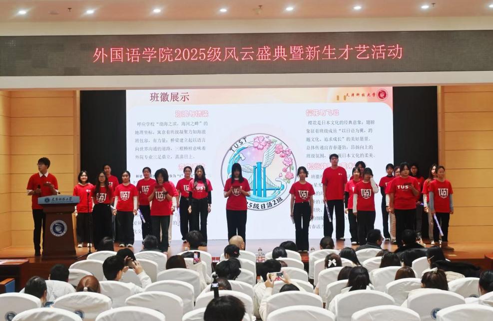 班徽展示环节,各班级尽情释放无限创意,设计出彰显班级独特风貌的精美班徽。图案中融入了外语元素、专业特色、班级号以及对未来的美好寓意,将班级精神诠释得淋漓尽致,彰显了同学们的巧思与对集体的认同。