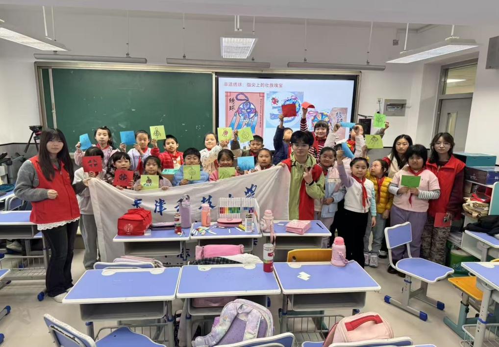 壮乡绣球承载着传情达意、节庆祈福的美好寓意,志愿者孙才涵以“绣球里的民族智慧”为主题,生动讲解了这门手艺的历史渊源与文化内涵。互动环节,同学们手持彩纸画笔,绘出蝴蝶纹样、吉祥图案等各具特色的绣球作品,尽显童真创意。