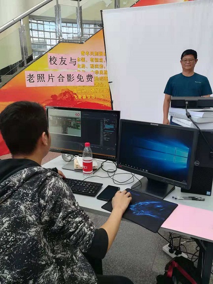 在大学生活动中心一楼,“重返青葱岁月——与科大老照片合影”活动吸引了许多返校校友驻足参与。校友们排队等候,依次站在白色幕布前,准备穿越时光重回30年前的母校。3分钟后,一张精致的合成照片发放到校友的手中,照片以30年前的天津轻工业学院校门为背景,通过计算机视觉合成技术,将人物融入场景之中,唤起校友们在校时的青春记忆。