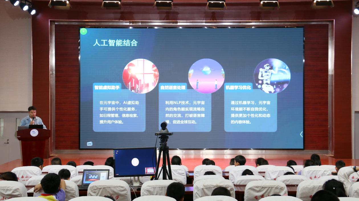 随后,筑梦萤火志愿者协会宣传部部长廖宇轩作为学生代表,为小学生们带来了关于“元宇宙、人工智能与数字中国”的主题宣讲,以元宇宙和人工智能的基础知识作为切入点,循序渐进地引导孩子们深入了解科技在各个领域的应用和发展趋势,并通过列举案例和讲述故事的方法,将元宇宙的发展历程娓娓道来,激发孩子们对科学技术的探索欲望,展现科技革命的磅礴之势。