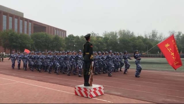 飒爽英姿迷彩装,女兵方阵靓儿郎。各分列式方队依次走向主席台,伴随着激昂的解说词进行分列式汇报。外院女兵方针巾帼不让须眉,步伐坚定有力,口号嘹亮响亮,展示了新一代外院学子的青春风采和精神风貌。
