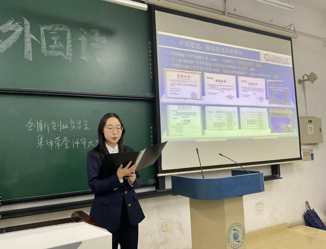 大会伊始,主持人对参评条件、评选办法等作了简要的介绍,并强调此次评选坚持公平、公开、公正的原则。随后,参与评选创新创业奖学金、优良学风班集体、先进集体的个人和集体代表分别从思想政治、学习成绩、竞赛成果、社会实践、未来规划、班级建设等各个方面,结合PPT,图文并茂地向评委们进行风采展示。