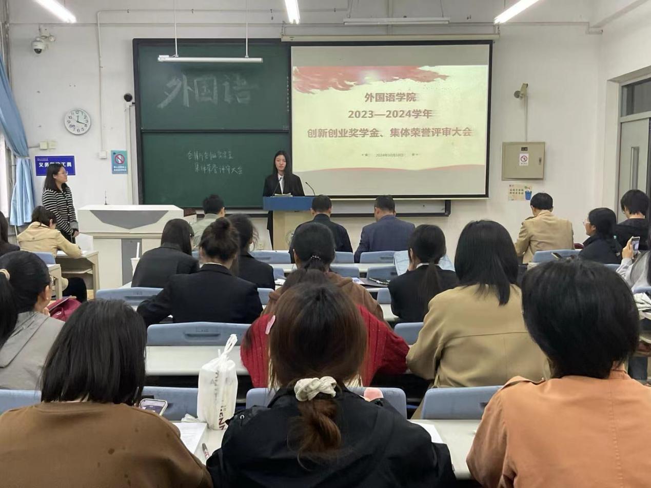 为切实做好学校关于各类奖学金和荣誉称号的评审工作,确保公平、公正、公开评选,并积极发挥优秀学生的先锋模范作用,外国语学院于2024年10月18日在3-104召开2023-2024学年创新创业奖学金、集体荣誉评审大会。外国语学院党委副书记王蕾、英语系系主任刘向东,日语系系主任赵俊槐,翻译系系主任郑东升以及全体辅导员老师和参评学生出席本次大会。