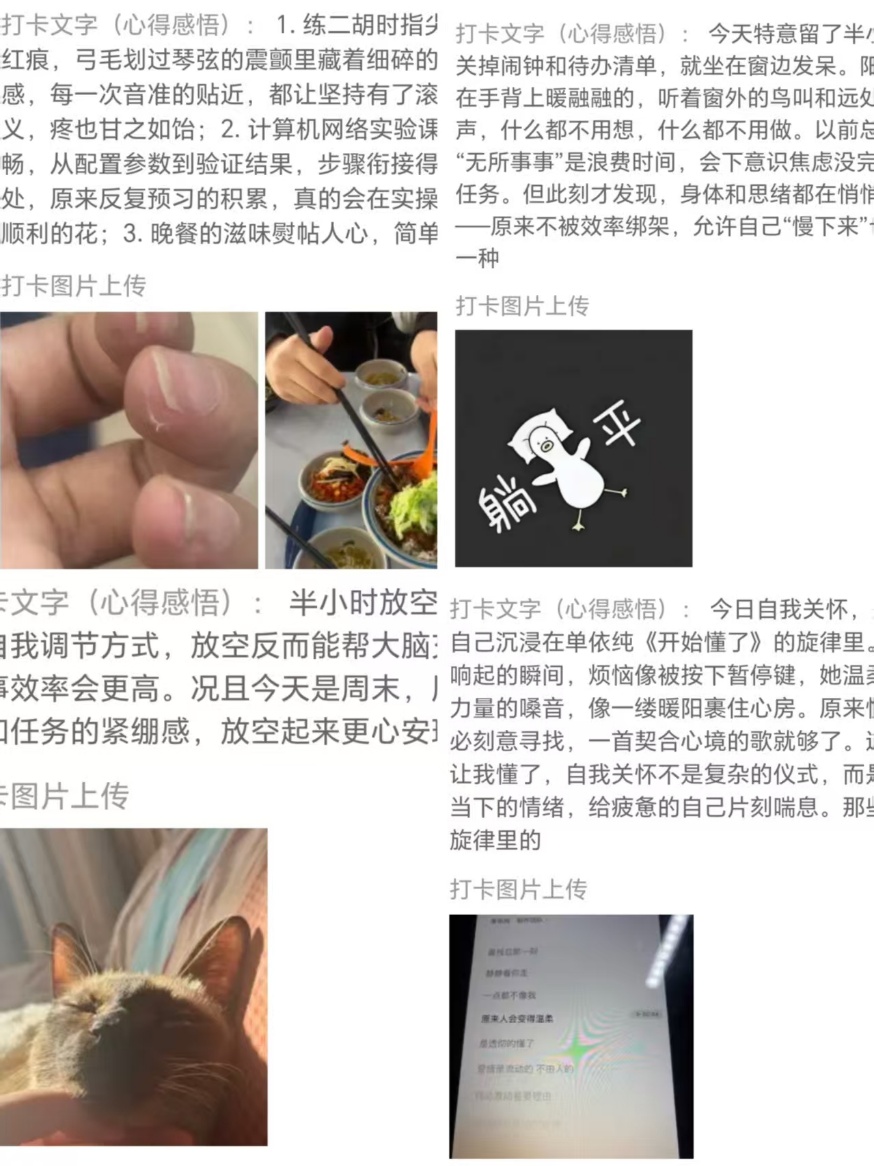 打卡区里,同学们用图文、短视频记录“冬日晚霞”的美丽,也分享了一首首风格迥异的歌曲带来的愉悦;生活中不起眼的小事被记录,同学们互相鼓励支持,让社群成为恒温37℃的情绪加油站。本次活动以“生活中一件小事的改变”为主题,营造积极支持的社群氛围。参与者通过完成21天的任务打卡,不仅提升了对于自我关怀和自尊水平的认识,同时在校园内营造了“关爱自我、积极向上”的心理氛围,为文明校园建设注入心理动能。