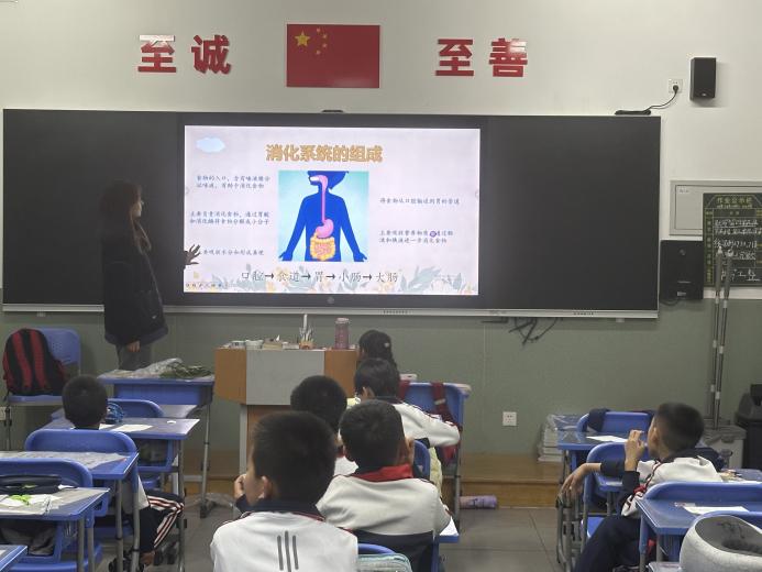 本次活动中,生物工程学院课后服务志愿者2023级本科生张学优从认识人体消化系统进行展开,介绍了食物是如何在人体内被消化吸收的,引导同学们对人体器官功能性进行思考,通过图文结合生动形象地向同学们详细介绍了食物消化吸收的过程,并采取奖励式授课方式,鼓励同学们积极互动,调动学生课堂积极性。课堂最后指出身体健康的重要性,以及同学们如何保护自己的身体,健康生活。