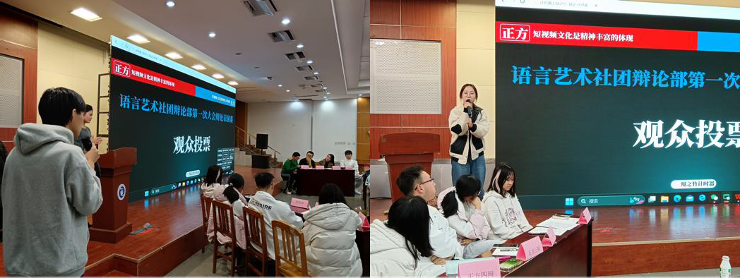 辩论环节:本次大会的最后,以一场激烈的辩论作为收尾本场的辩题是“短视频文化是精神丰富/匮乏的体现”。思想的碰撞擦出了思维的火花,辩论部的同学们就热点话题展开了激烈而富有建设性的讨论,让我们拓展了视野,感受到了知识的魅力。