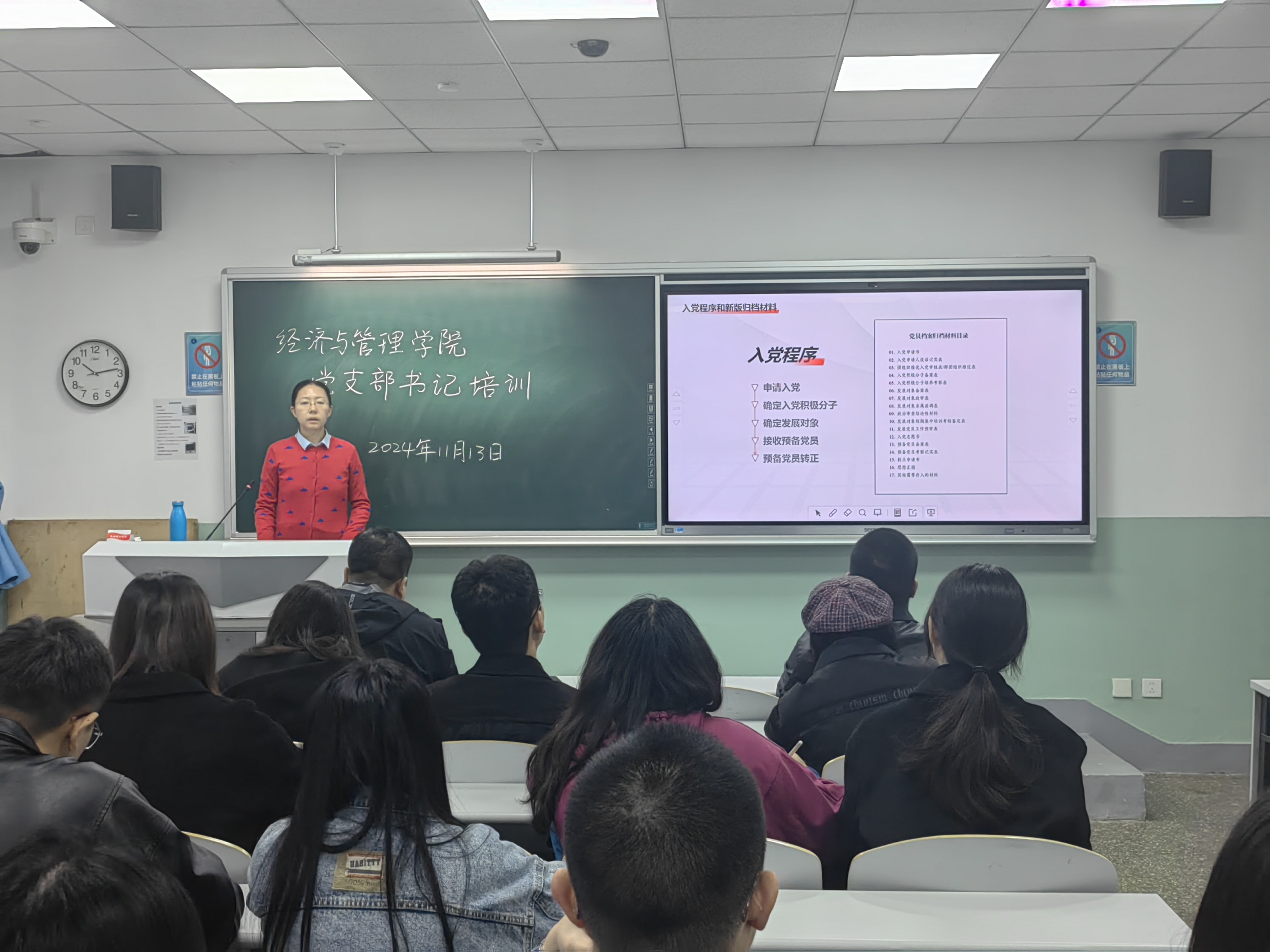 张一老师围绕党员发展的全过程,从申请入党到预备党员转正,包括确定入党积极分子、发展对象、接收预备党员等关键环节,进行了全面而细致的梳理。她不仅详细阐述了新版党员发展材料的规范要求,还特别强调了本学期发展党员材料填写与审核的注意事项,并对近期支部党员发展及转正工作中的重点事项进行了深入提示。