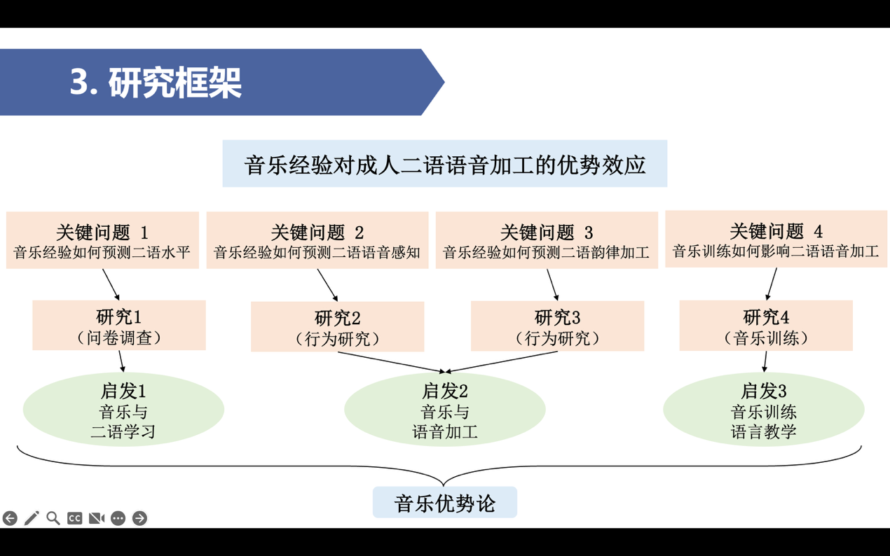 她详细介绍了音乐经验对二语水平的预测、语音感知、韵律加工的影响,以及短期音乐训练对成人二语语音加工的干预效果。研究结果显示,音乐经验尤其是音高与节奏维度的训练,显著提升英语和汉语二语学习者的语音感知与韵律理解能力。同时,视觉节奏训练等多模态训练方式在提升语音加工方面表现出更优效果。