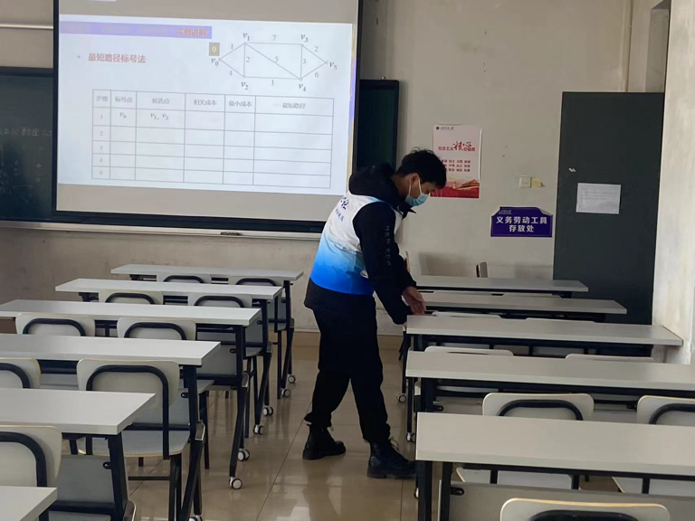 为保证本次活动成功举办,在比赛开始前,志愿者们提前到达场地,对教室卫生进行整理和打扫。