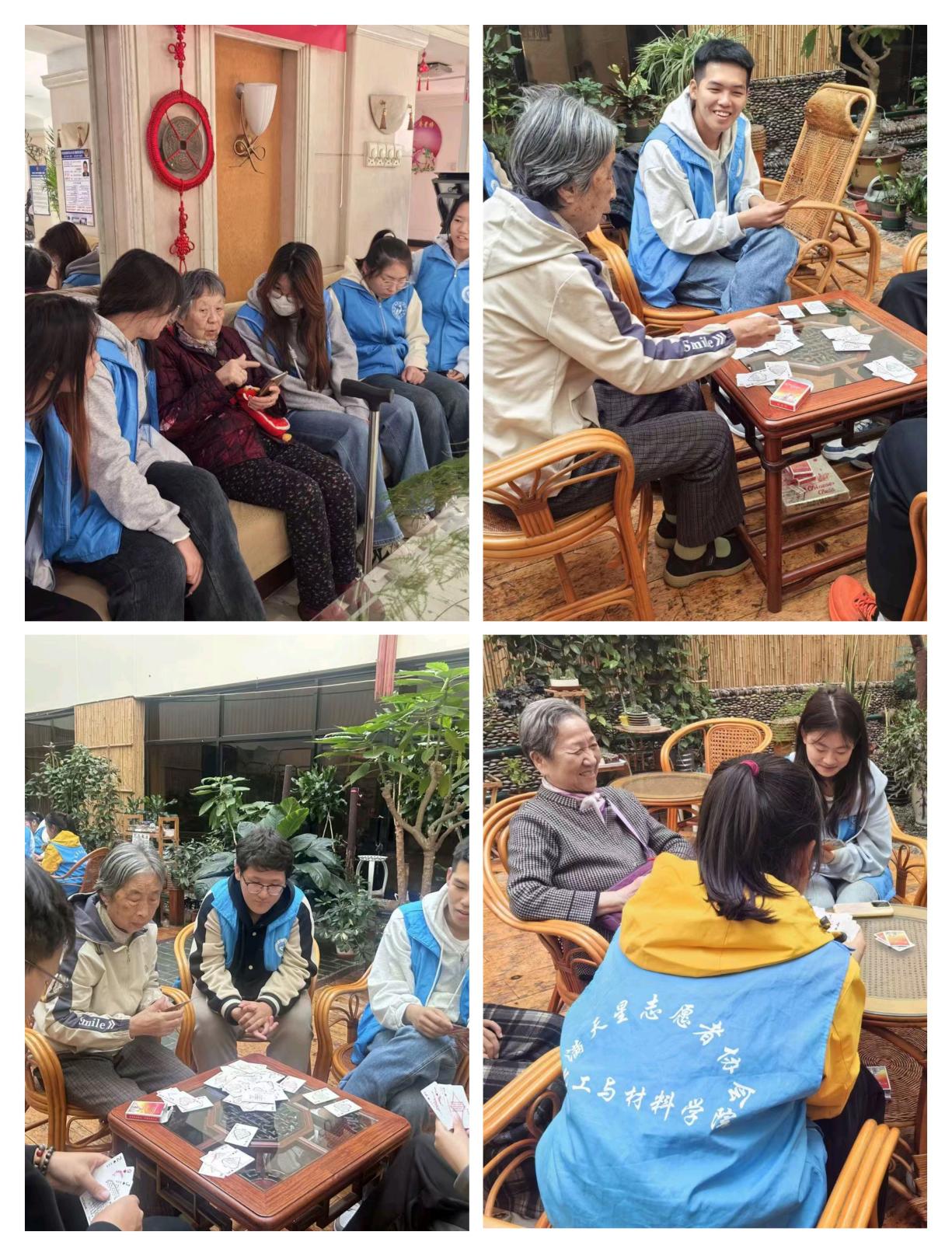 活动中,穿着“蓝马甲”的志愿者们怀着一颗关爱老人的心热情洋溢地与老人们亲切交谈,聆听他们自己的故事、兴趣爱好等,并了解他们的身体状况,从交流沟通中表达关怀和爱意;志愿者们还与老人们对弈牌技、做游戏,为老人们平静的生活增添无限乐趣,使他们脸上绽放灿烂的笑容。这一幅幅温馨的画面是“蓝马甲”的青春活力与“夕阳红”的鹤发童颜相互碰撞的场景,更是当代青年人积极践行敬老爱老精神的生动写照。