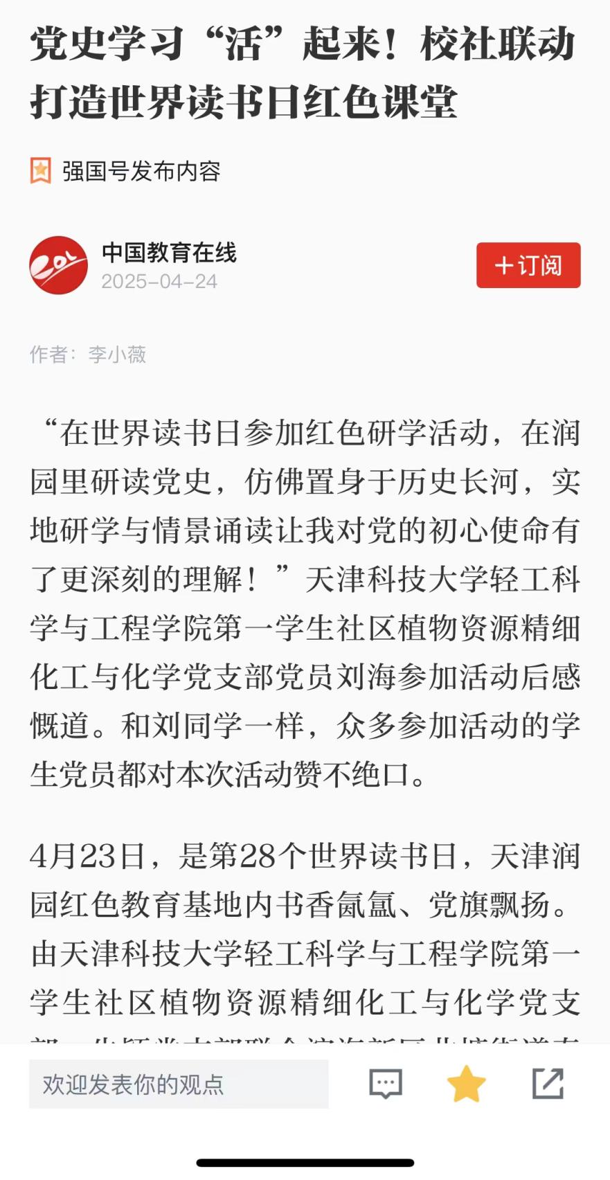4月23日,是第28个世界读书日,轻工科学与工程学院第一学生社区植物资源精细化工与化学党支部、朱颖党支部联合滨海新区北塘街道泰达御海社区党委在天津润园开展了“追寻红色足迹·传承精神血脉”主题读书活动。党员手捧《中国共产党简史》,通过实地研学、情景诵读、专家导览等形式,在历史场景中深度研读党史,以红色书香浸润初心使命。