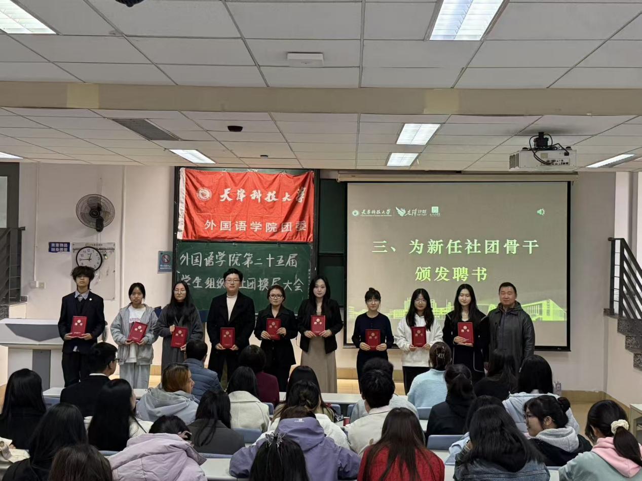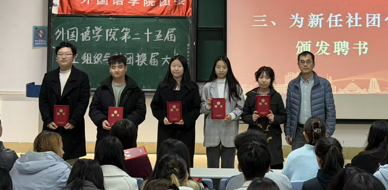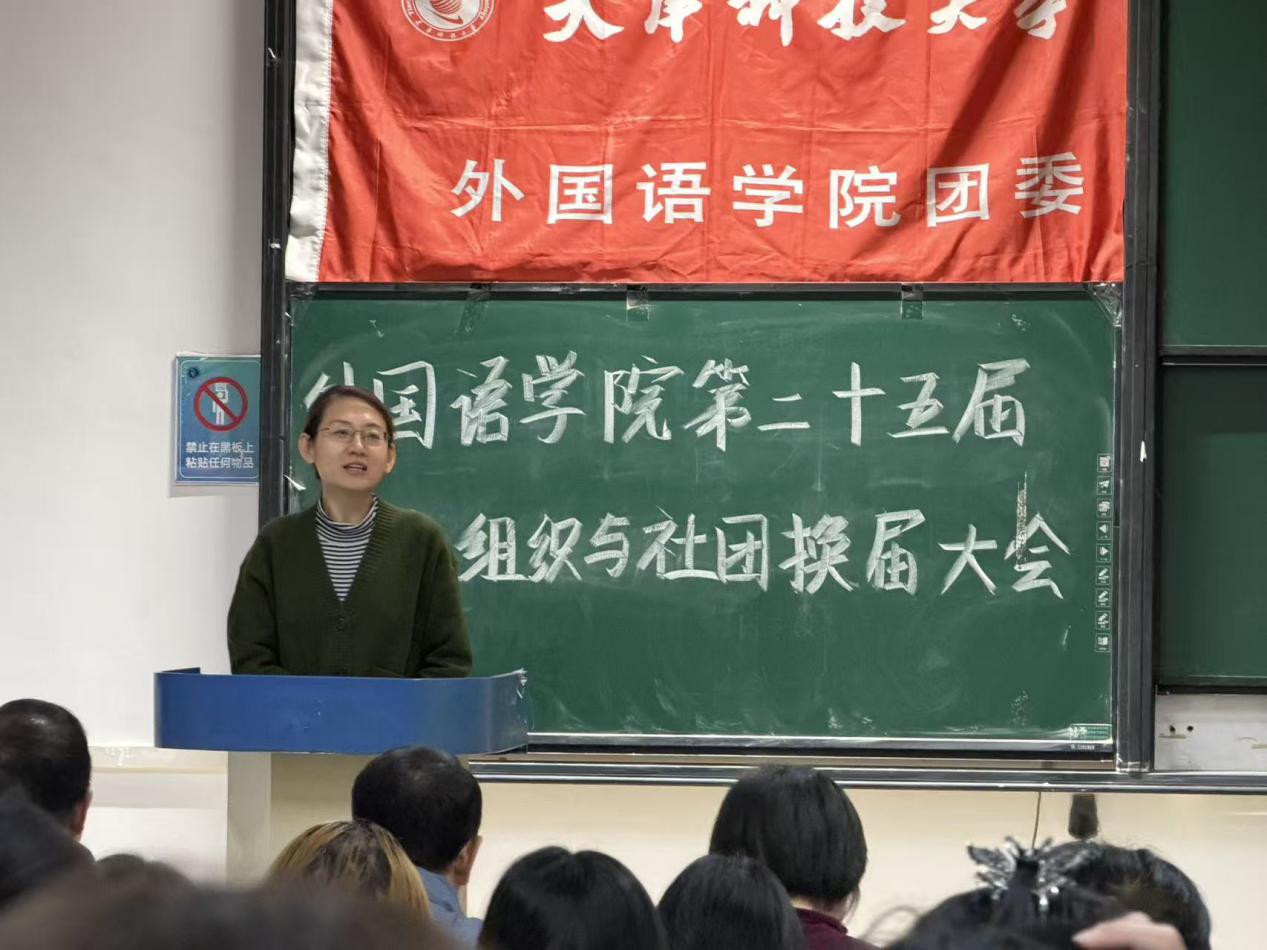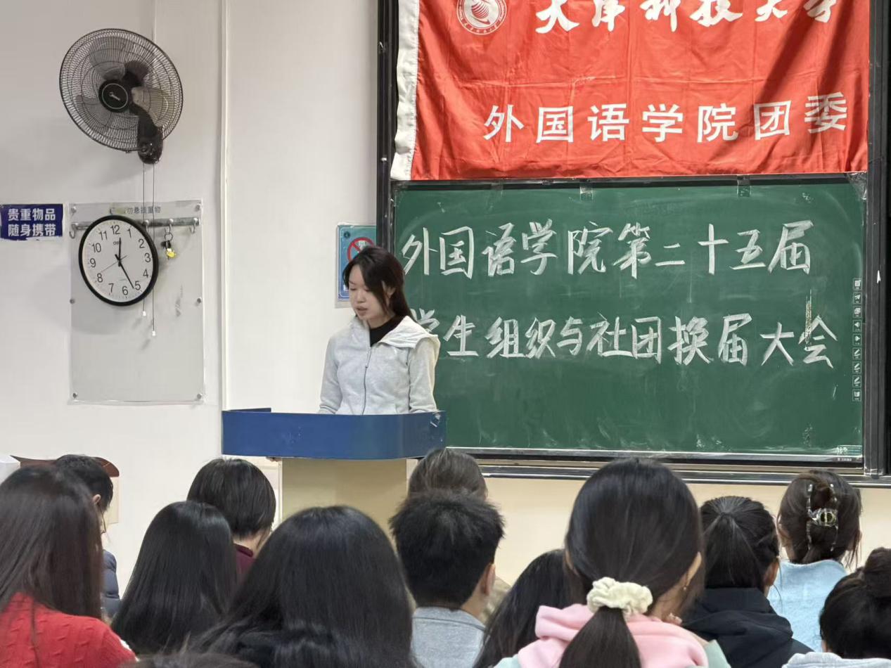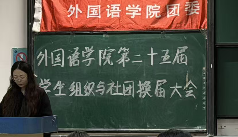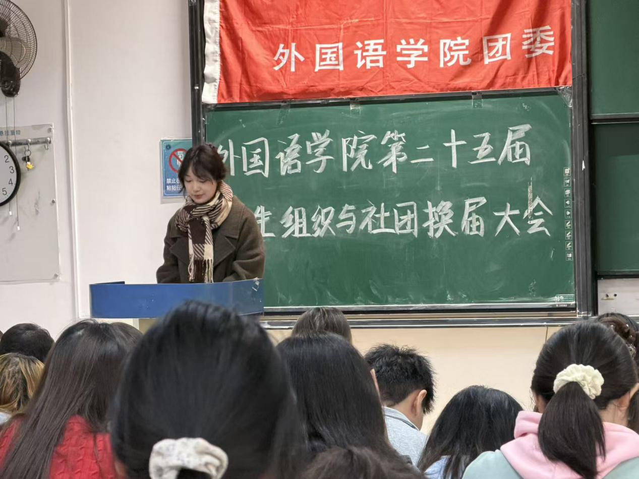 为进一步激发学生社团发展活力,保障社团建设的连续性与稳定性,以“先锋”精神为牵引凝聚奋斗力量,切实加强学生社团干部体系建设,10月23日,外国语学院于图书馆 9-4 阶梯教室召开 2025 届学生社团换届大会。学院党委副书记王蕾、团委负责人孙颖老师、党建中心主任于叶青老师、新闻中心指导老师刘婧怡老师、大学生日本语言文化协会指导老师赵俊槐老师、英语演讲与辩论社团指导老师易龙老师,以及 2024-2025 学年各社团骨干成员共同出席会议。本次大会由外国语学院团委副书记刘婷婷主持。