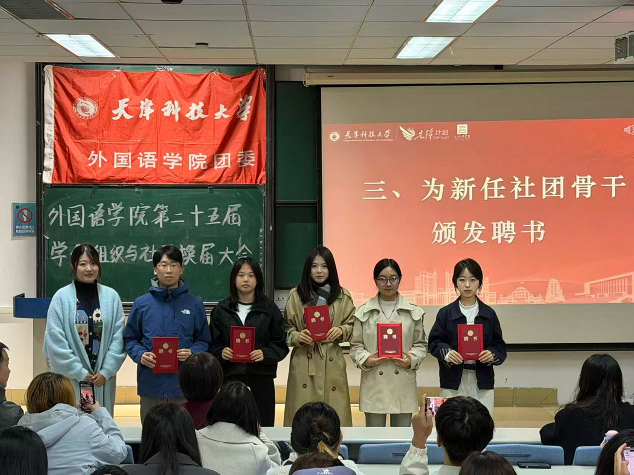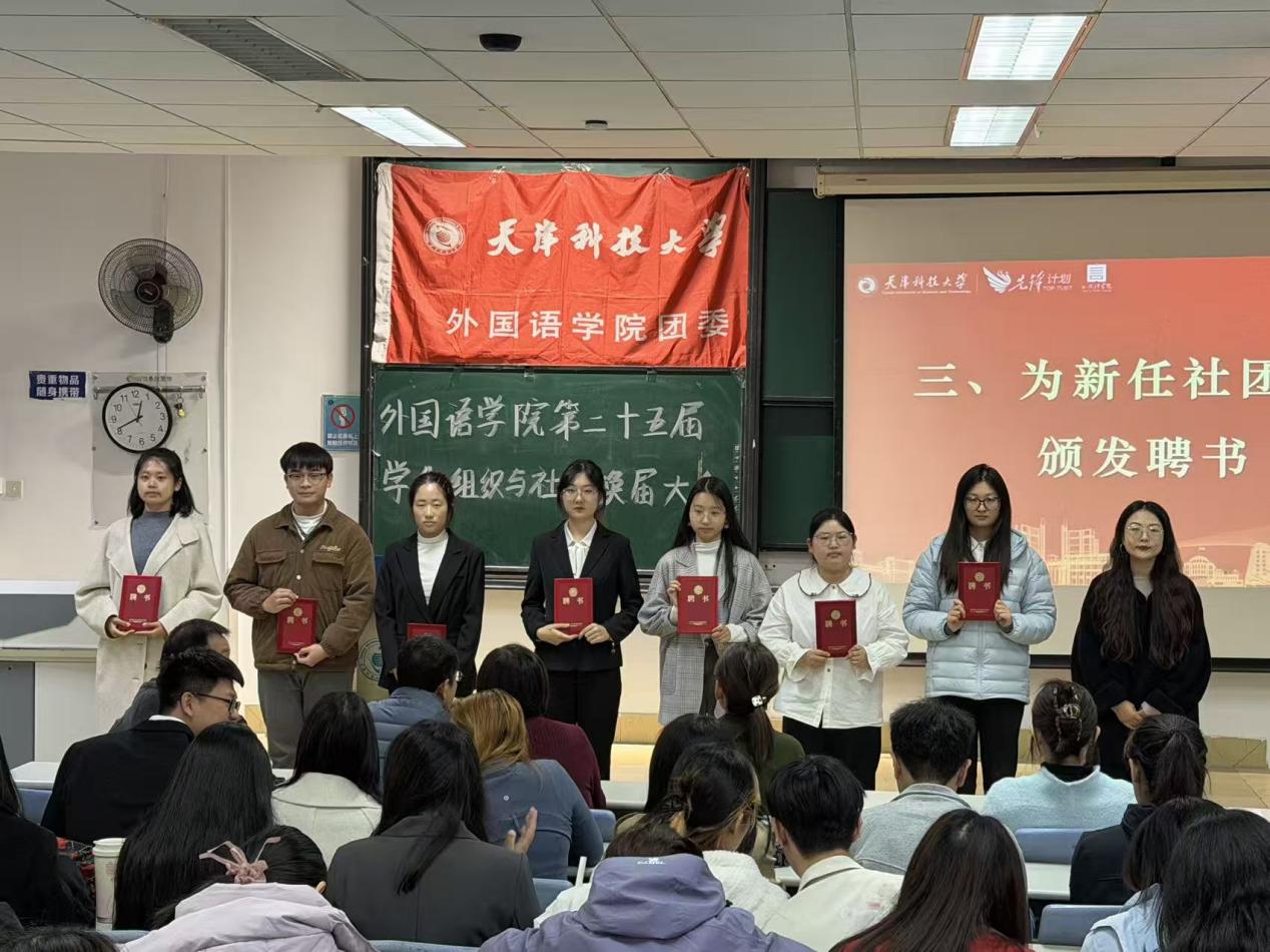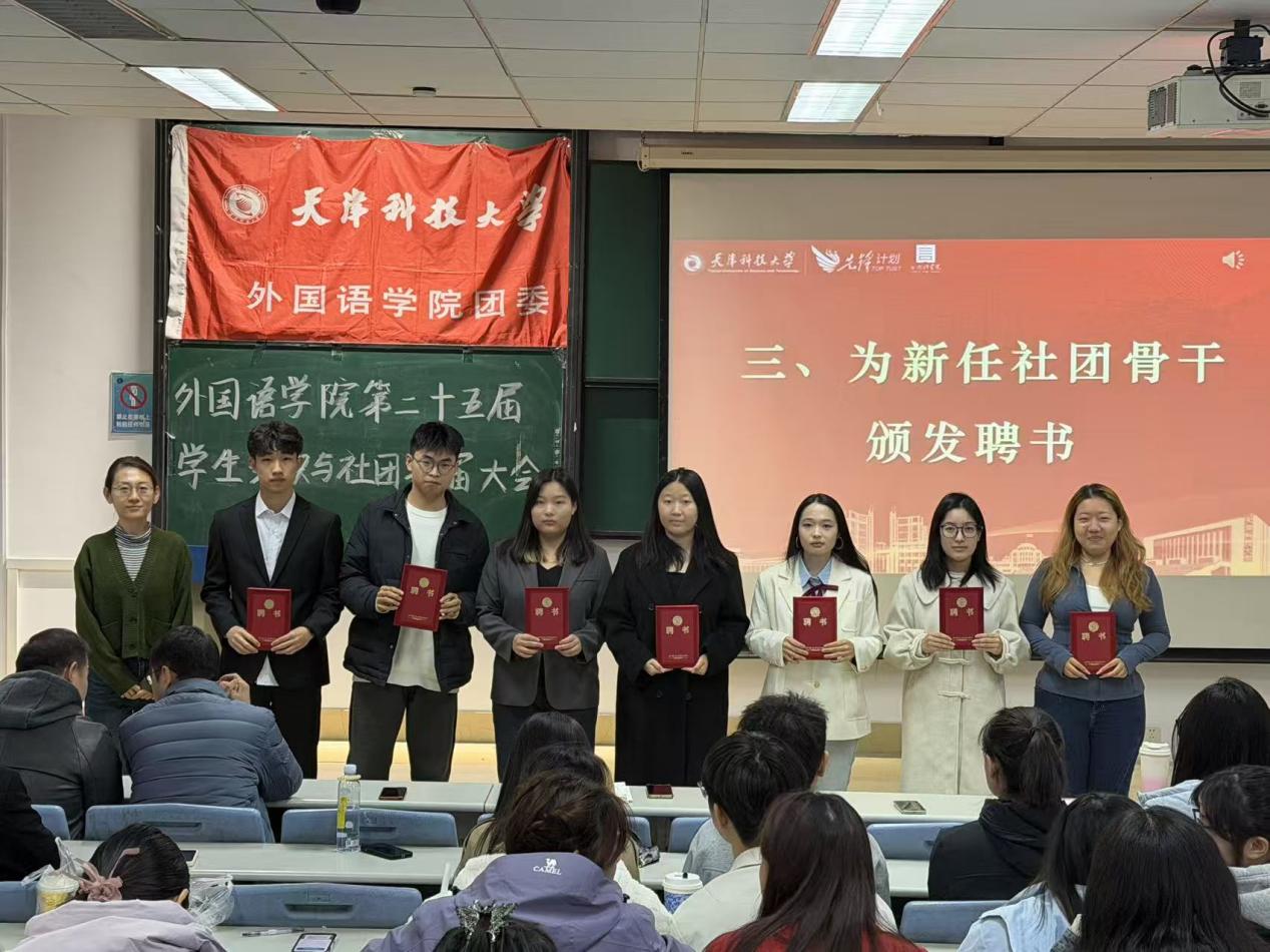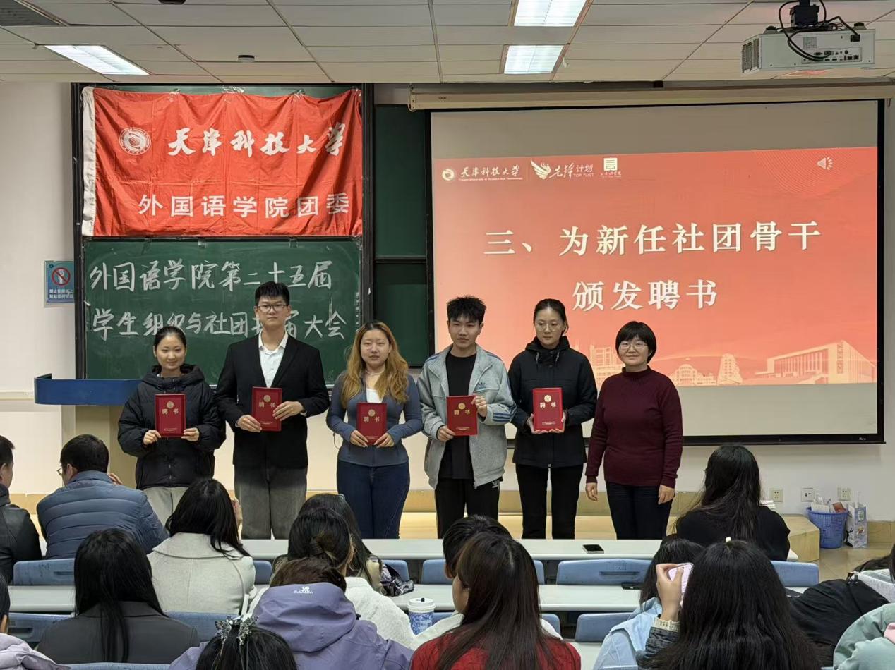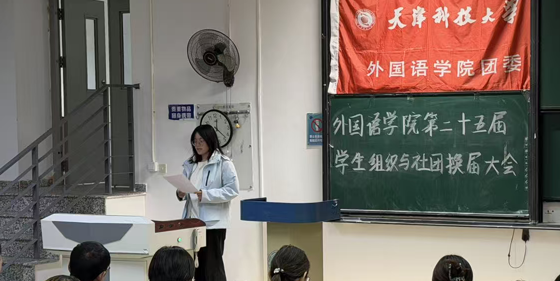 为进一步激发学生社团发展活力,保障社团建设的连续性与稳定性,以“先锋”精神为牵引凝聚奋斗力量,切实加强学生社团干部体系建设,10月23日,外国语学院于图书馆 9-4 阶梯教室召开 2025 届学生社团换届大会。学院党委副书记王蕾、团委负责人孙颖老师、党建中心主任于叶青老师、新闻中心指导老师刘婧怡老师、大学生日本语言文化协会指导老师赵俊槐老师、英语演讲与辩论社团指导老师易龙老师,以及 2024-2025 学年各社团骨干成员共同出席会议。本次大会由外国语学院团委副书记刘婷婷主持。