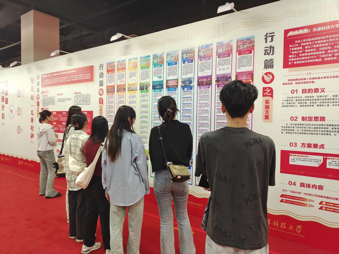 讲解员详细为学生们讲述了“携手共建篇”“融入服务篇”“未来展望篇”三个篇章包括“天津科技大学滨海办学20年成果展”以及“‘先锋计划’三部曲”“入驻滨海以来学校事业发展大事记”“研究生院建院十周年”三个专题展的各项内容。参观过程中,学生们深入了解了学校“坚持拓展轻工特色,精心培育行业中坚,矢志服务国计民生”的优良办学传统,发扬勇立潮头的先锋精神和艰苦奋斗的创业精神,扎根滨海、服务滨海、传薪赓火、蓄势未来的发展历程,以及学校在人才培养、科学研究、社会服务、传承创新上取得的突出成果。