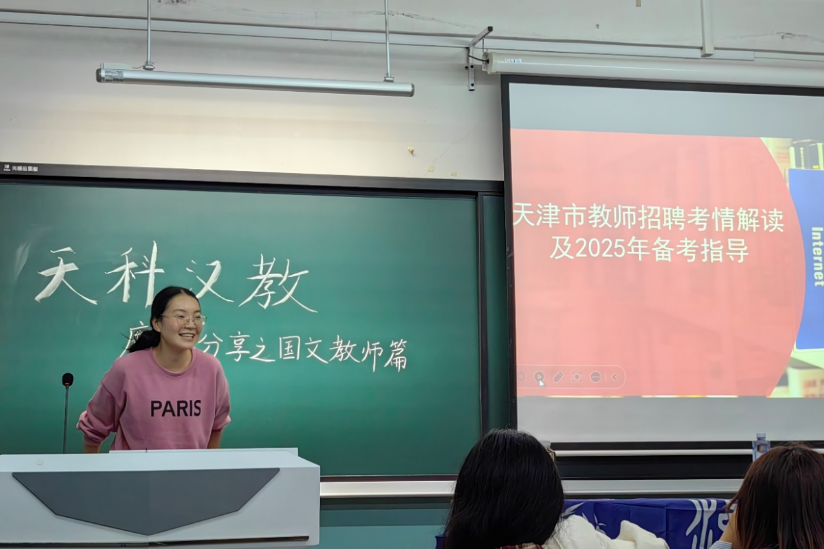 崔欣宇同学毕业后积极考取教师编制,现为天津市南开区中心小学语文教师。崔欣宇同学大学期间积极尝试各类工作岗位,职业规划明晰,在今年的教师编考试中取得了优异的笔试和面试成绩。此次活动中,崔欣宇结合自己的考编之路,对教师编考试的主要内容、形式,以及备考、笔试、面试等方面进行了细致入微的介绍,与学弟学妹们分享了教师的职业价值与待遇等内容。建议有志于考教师编的同学提前做好规划,坚定目标,提高备考时的专注力和学习效率。在互动环节,针对在读同学们提出的问题,崔欣宇校友耐心细致地逐一解答,现场互动氛围轻松活跃。