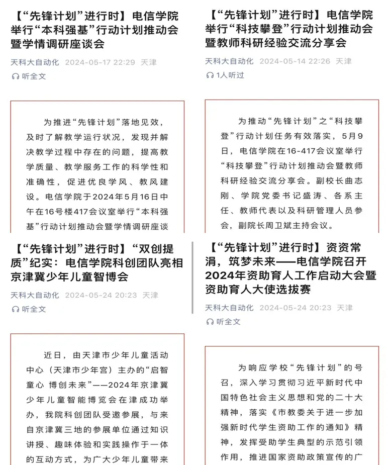 在电信学院,面向党支部、团支部、教工支部均开展了形式多样的宣讲讨论。一是各基层党支部书记以“三会一课”、主题党日的形式,围绕深入学习宣传贯彻习近平文化思想、发展“先锋文化”广泛开展学习研究和宣讲讨论;二是各年级辅导员、学生干部走进班团组织,以班团会的形式宣讲“科大共识”;三是师生录制微视频,宣讲“先锋文化”;四是开展“我的先锋故事”“我眼中的先锋文化”主题活动,为学生搭建平台,表达追“锋”感悟,让“先锋文化”浸润师生心灵,形成深刻共识,激发践行动力。
