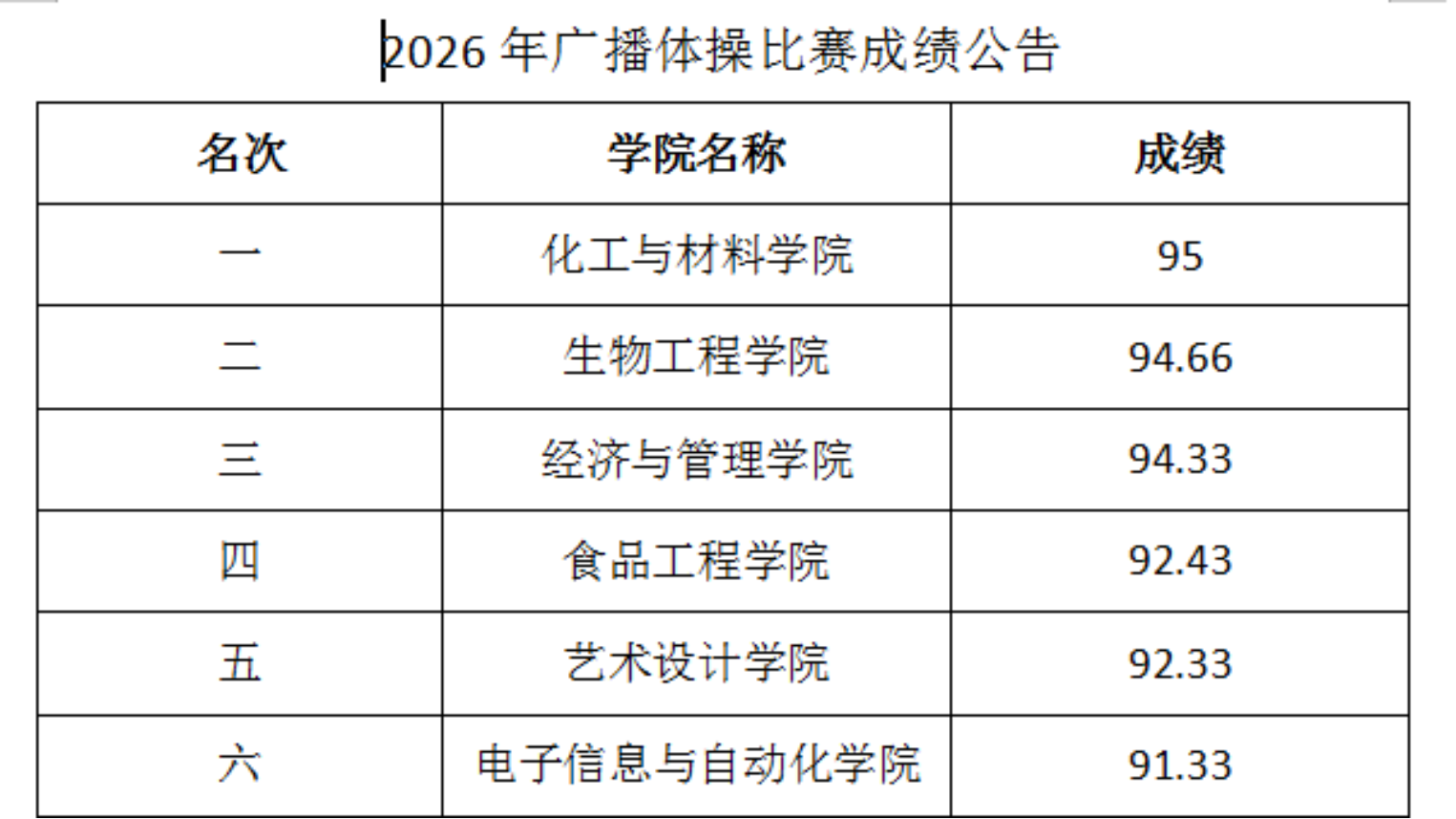 2026年广播体操比赛前六名学院及成绩如下: