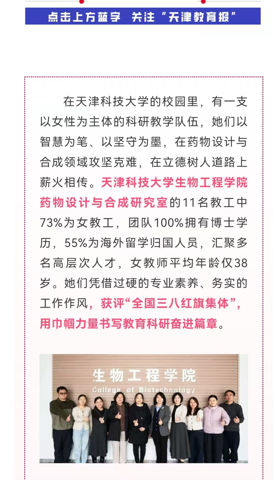 报道指出,在天津科技大学的校园里,有一支以女性为主体的科研教学队伍,她们以智慧为笔、以坚守为墨,在药物设计与合成领域攻坚克难,在立德树人道路上薪火相传。天津科技大学生物工程学院药物设计与合成研究室的11名教工中73%为女教工,团队100%拥有博士学历,55%为海外留学归国人员,汇聚多名高层次人才,女教师平均年龄仅38岁。她们凭借过硬的专业素养、务实的工作作风,获评“全国三八红旗集体”,用巾帼力量书写教育科研奋进篇章。