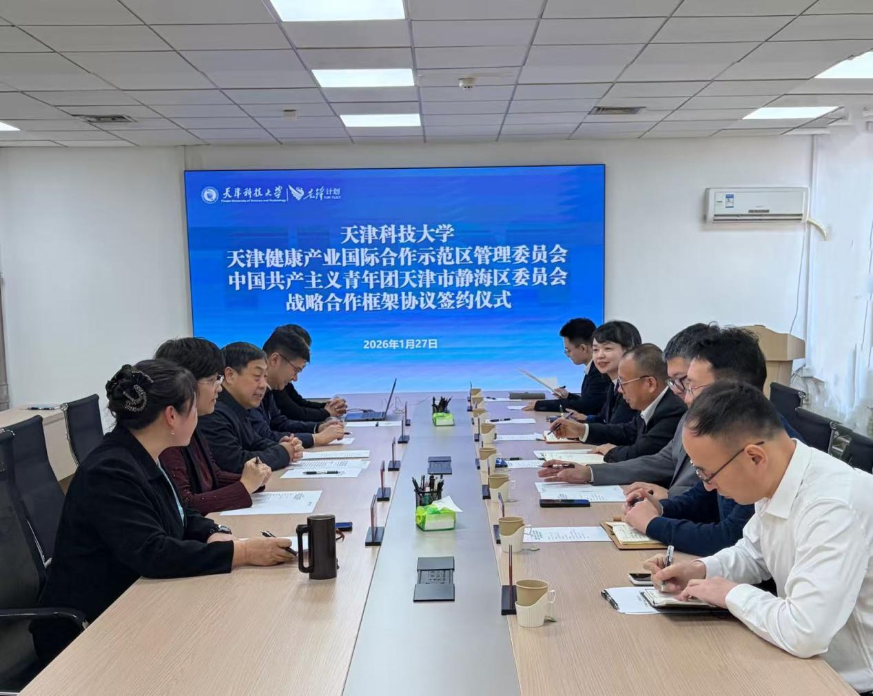 为深化产教融合、服务区域发展,构建校地协同、资源共享的长效机制,1月27日,天津科技大学与天津健康产业国际合作示范区管理委员会、中国共青团天津市静海区委员会战略合作框架协议签约仪式在我校滨海校区图书馆举行。校党委常委、副校长高发明出席仪式并讲话。天津健康产业国际合作示范区管委会党委书记张瑛、团静海区委书记邢科慧等三方代表共同参加签约仪式。