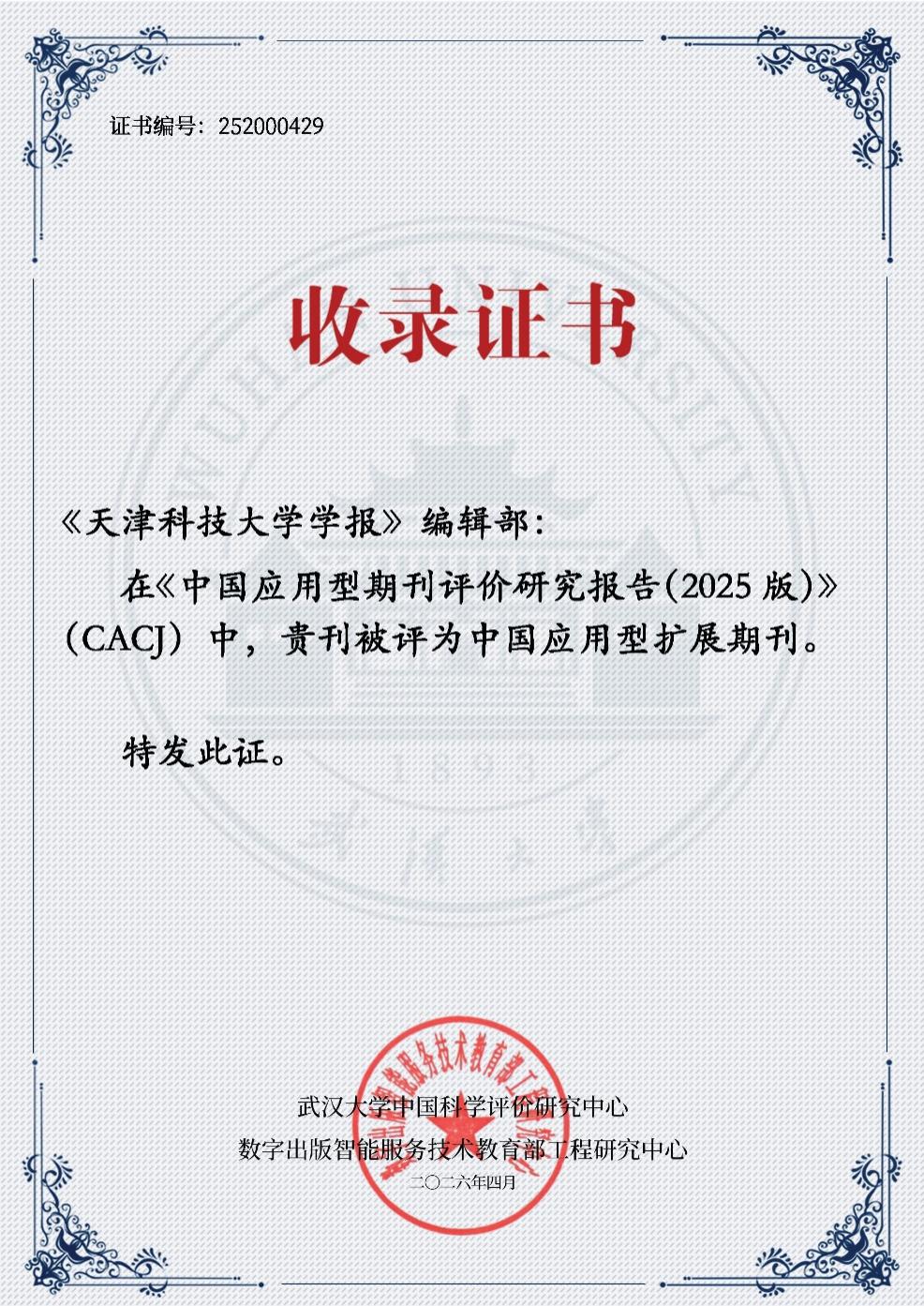 近日,由武汉大学中国科学评价研究中心、数字出版智能服务技术教育部工程研究中心联合开展的2025版应用型期刊评价工作顺利完成。《中国应用型期刊评价研究报告(2025版)》正式发布,《天津科技大学学报》获评中国应用型扩展期刊。
