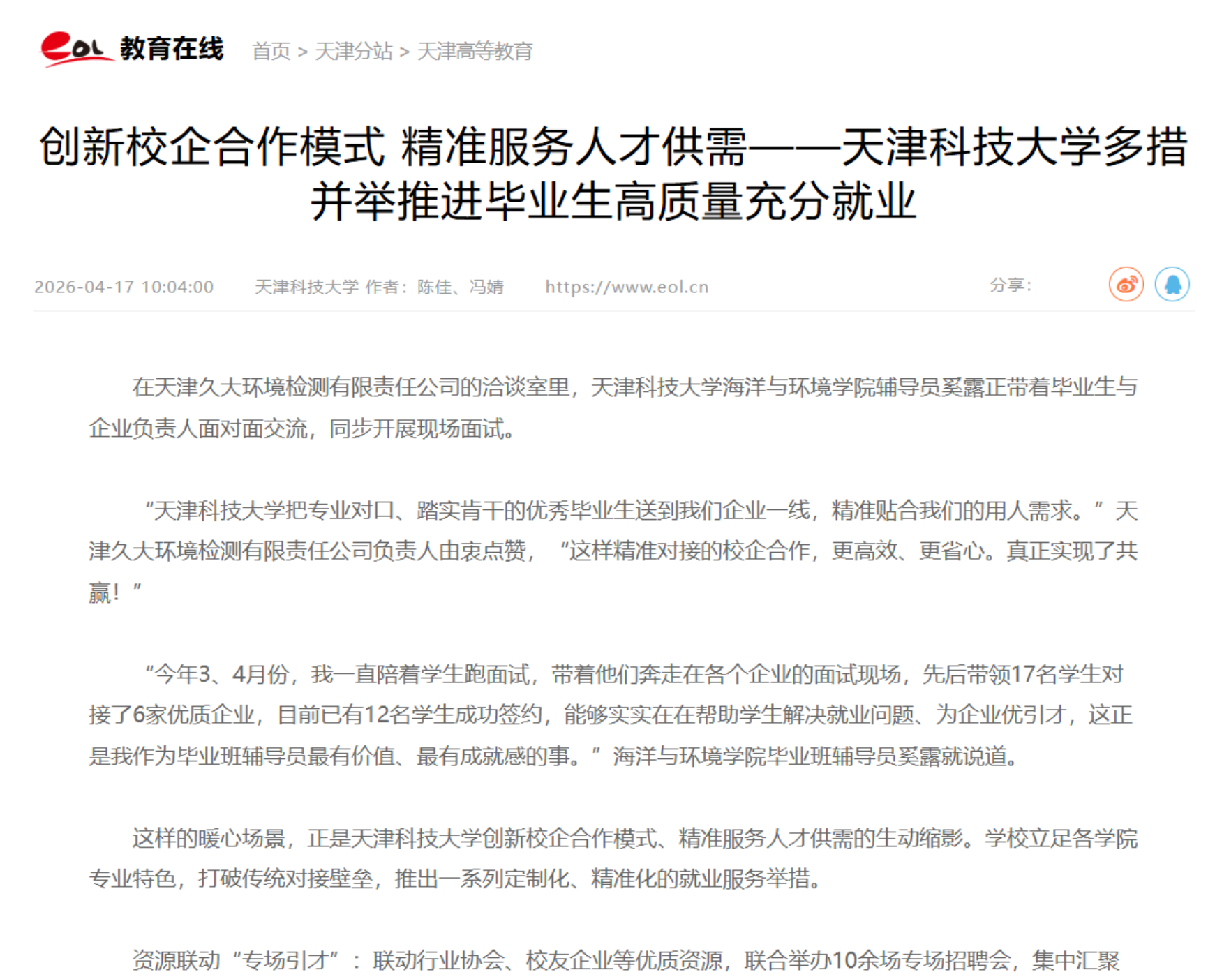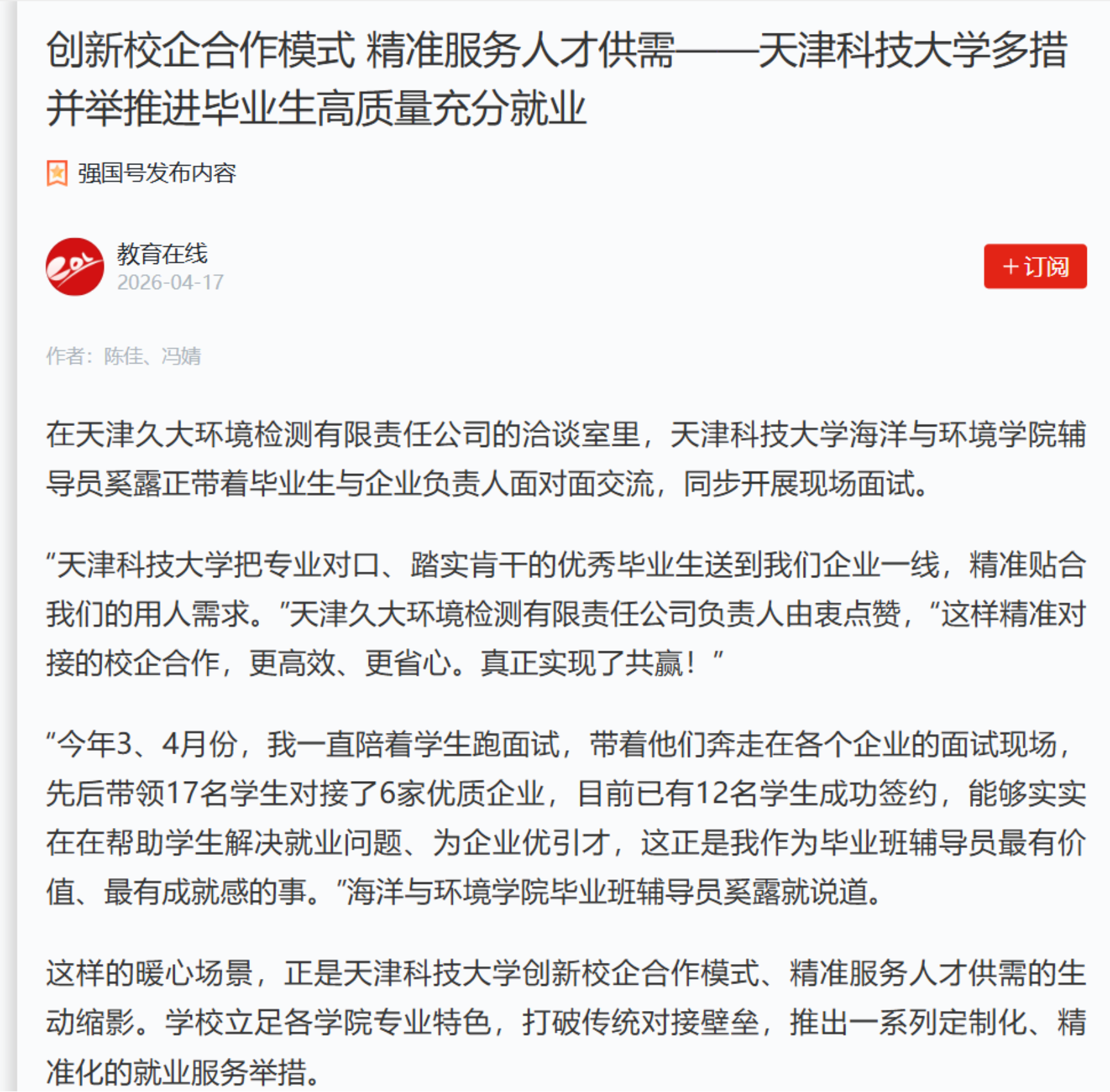 4月17日,学习强国、津云、中国教育在线等媒体报道天津科技大学多措并举推进毕业生高质量充分就业。