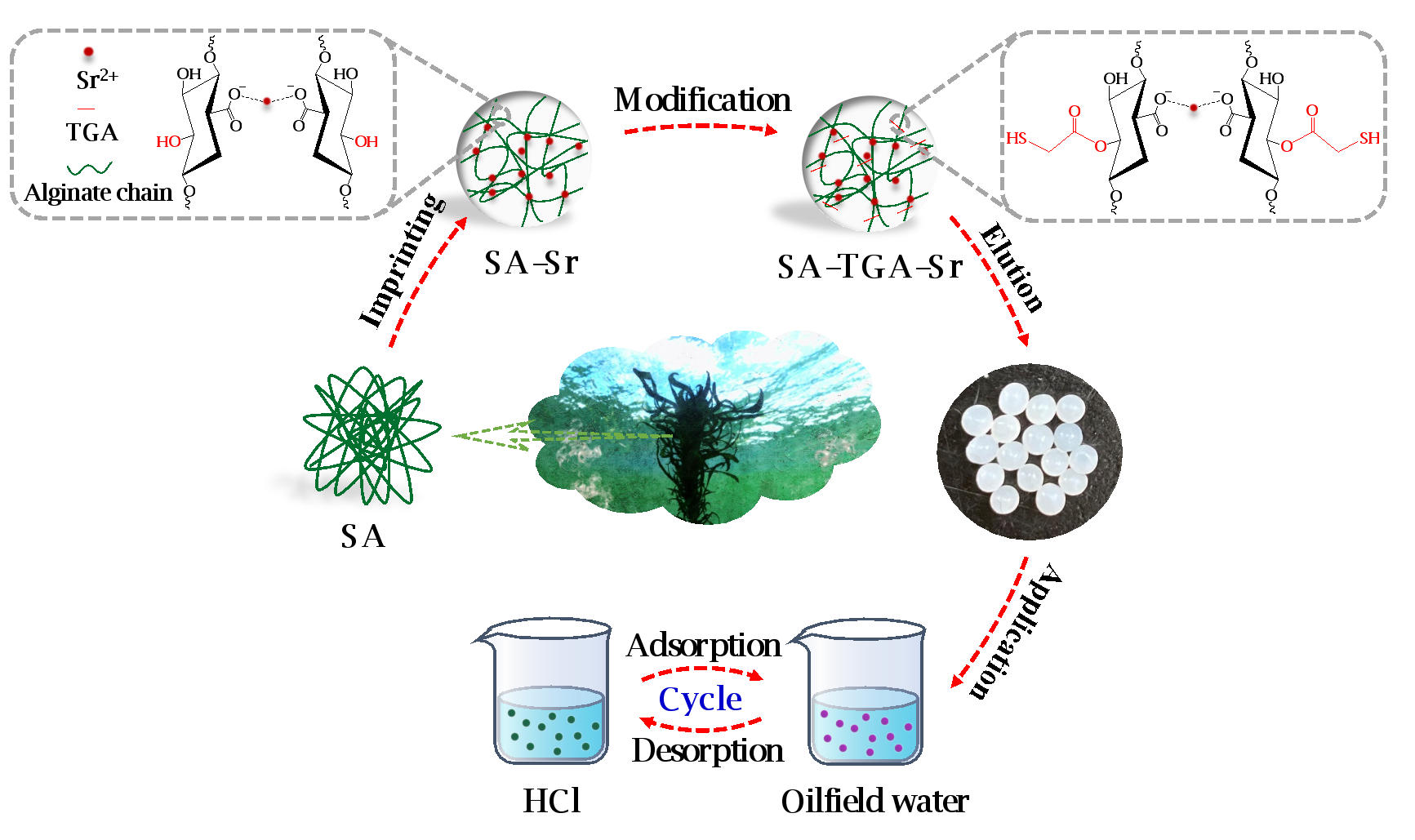 《Chemical Engineering Journal》(2021, 410: 128267)刊登了“Selective recovery of strontium from oilfield water by ion-imprinted alginate microspheres modified with thioglycollic acid”。该文第一作者为博士生刘灿,通讯作者为余晓平副研究员和邓天龙教授,天津科技大学为第一署名单位和通讯作者单位。针对卤水中锶的分离提取,该团队以亲水性海藻酸钠(SA)为基体材料进行吸附提锶研究。通过以Sr2+进行离子印迹,并经造粒成型和TGA改性后,材料的吸附容量高达177 mg/g,远高于国内外已报道的吸附提锶材料,具有重要的工业应用前景。