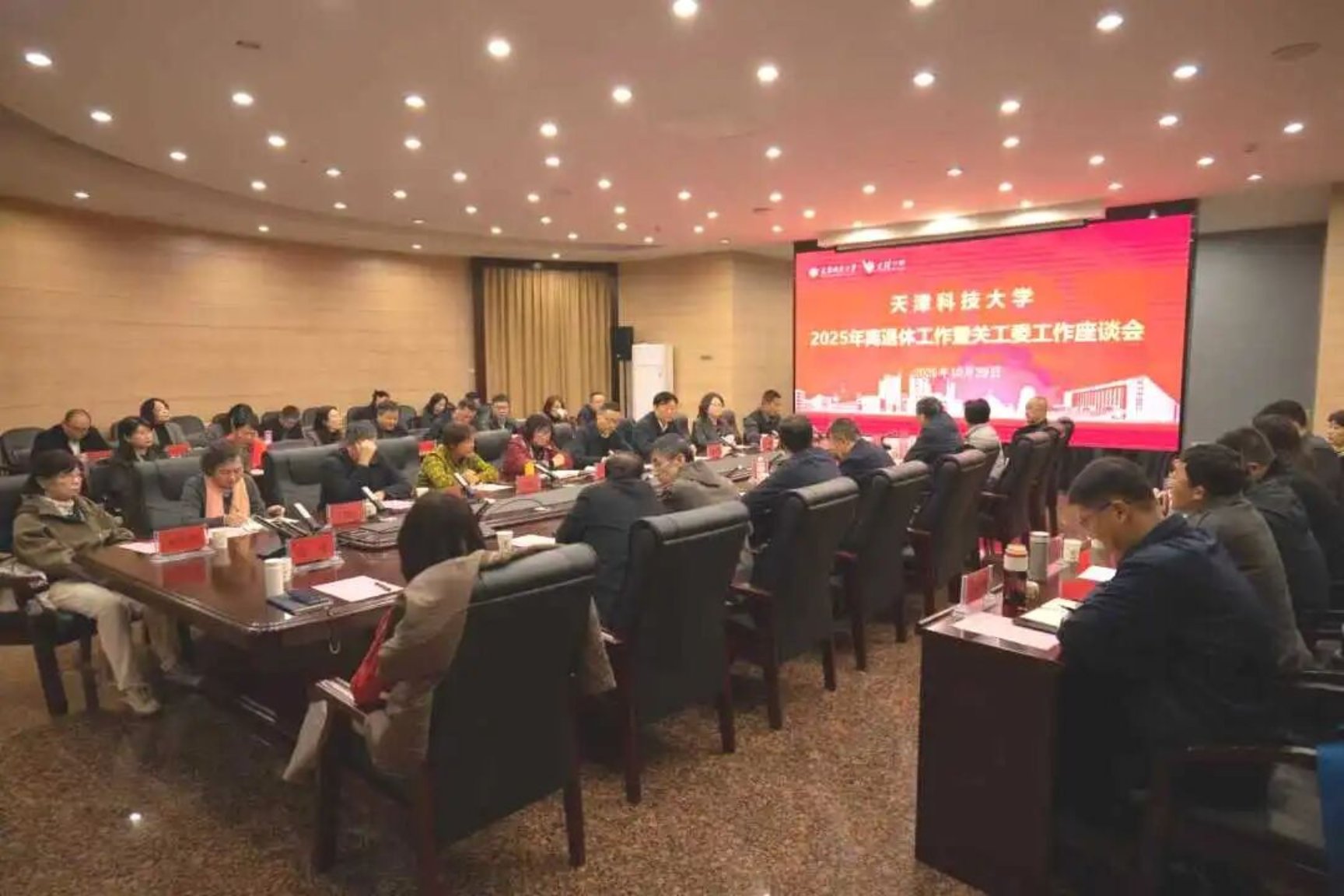 金秋送爽,丹桂飘香。重阳佳节,天津科技大学召开2025年离退休工作暨关工委工作座谈会。此次座谈会既是以实际行动弘扬尊老敬老的传统美德,向为学校发展倾注心血的老同志致以节日的诚挚问候,更是立足学校发展关键节点,向老同志汇报近况、倾听宝贵意见建议,凝聚银发智慧,共同推动学校高质量内涵发展。校党委副书记、校长路福平,校党委副书记、关工委主任贾启君,原校党委副书记、关工委常务副主任潘秀山,校关工委委员、校离退休工作及关工委工作成员单位负责同志、二级单位党委(总支)负责同志、二级单位关工委常务副主任参会,会议由贾启君主持。