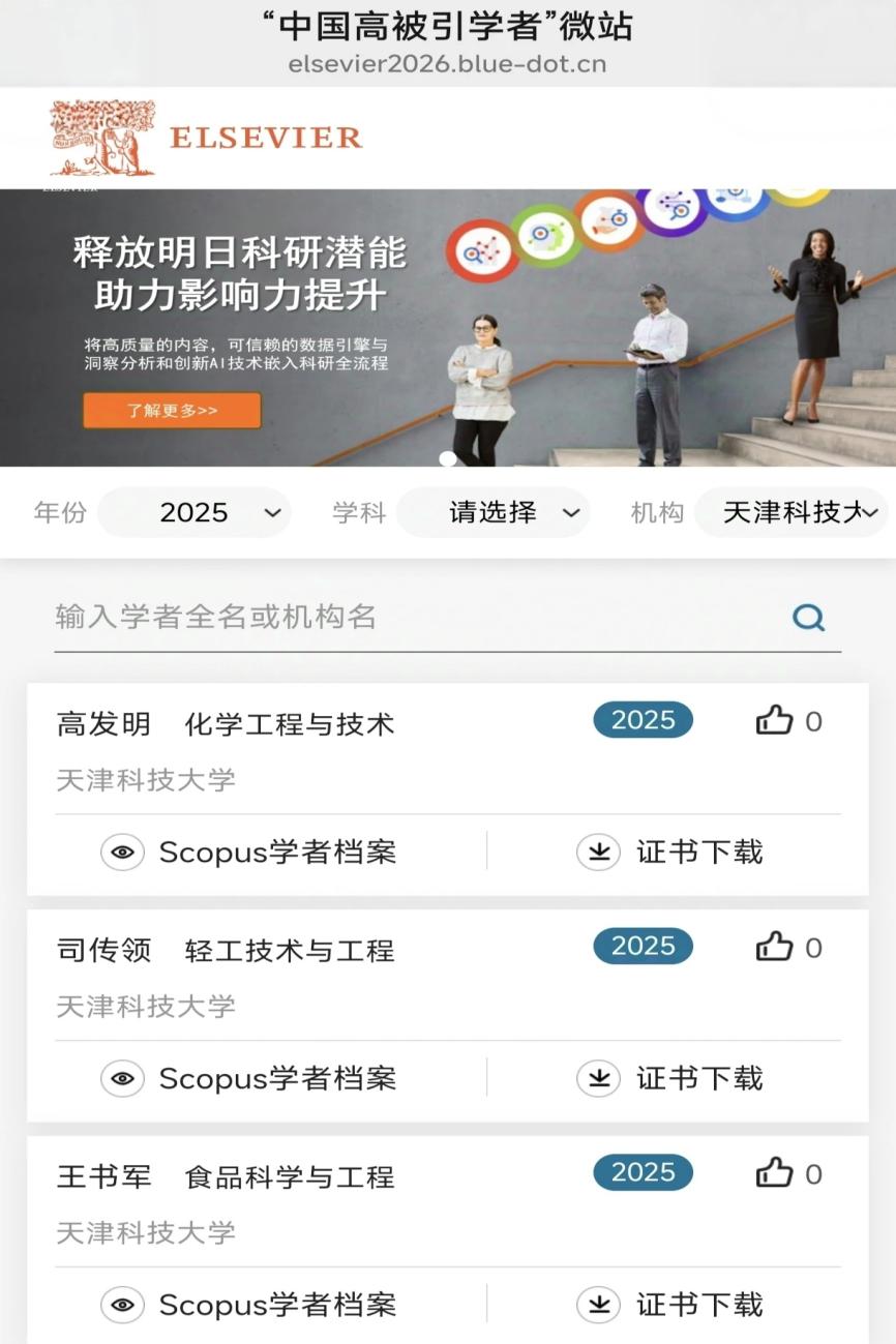 近日,国际知名学术出版集团爱思唯尔(Elsevier)正式发布2025“中国高被引学者”(Highly Cited Chinese Researchers)榜单。我校高发明、司传领、王书军三位学者凭借深厚的学术积淀与突出的科研贡献,分别入选化学工程与技术、轻工技术与工程、食品科学与工程领域榜单。