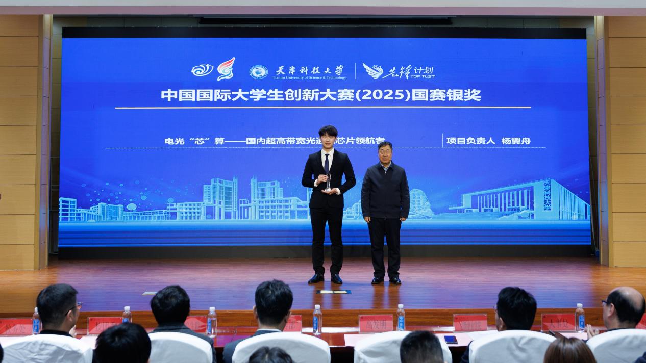 活动现场,与会领导嘉宾为2025年度校赛优秀组织学院、大赛获奖团队和个人颁奖。优秀指导教师代表王樱洁老师与团队代表郭嘉琛同学分别进行了经验交流和项目展示。