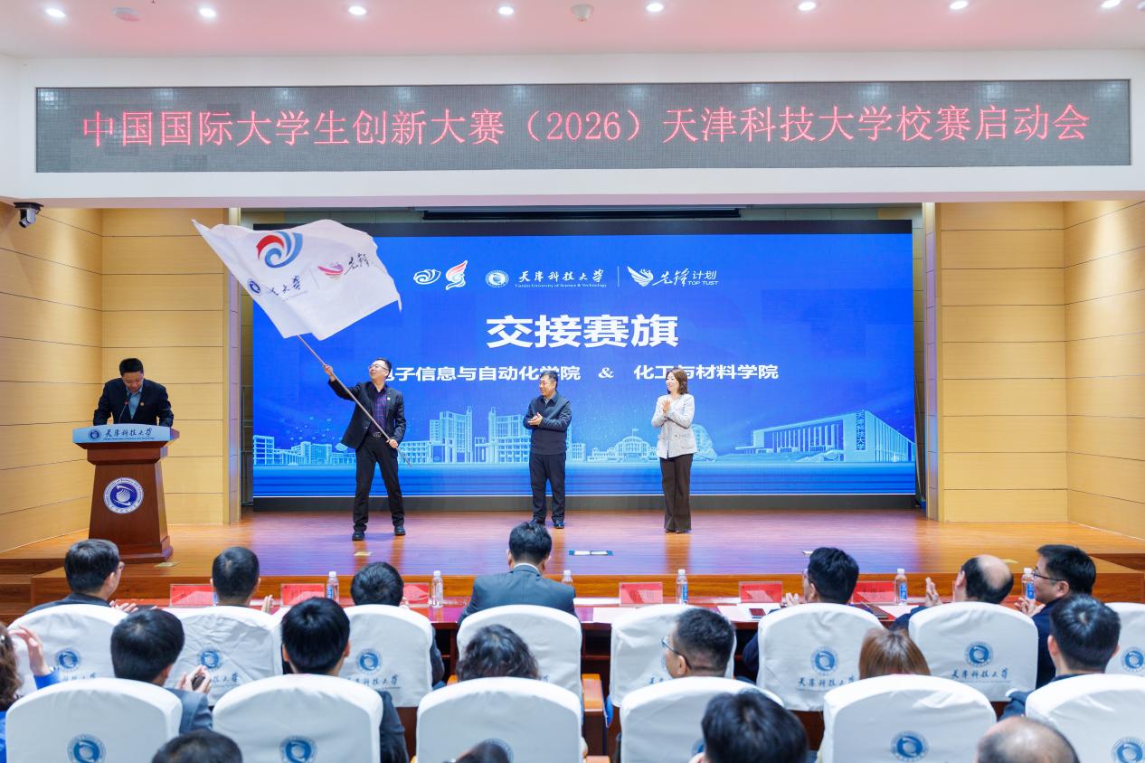 聚全场瞩目,承奋进之约。大赛赛旗由化工与材料学院交接给电子信息与自动化学院,主题为“我敢闯,我会创”的2026年中国国际创新大赛校赛正式拉开帷幕。