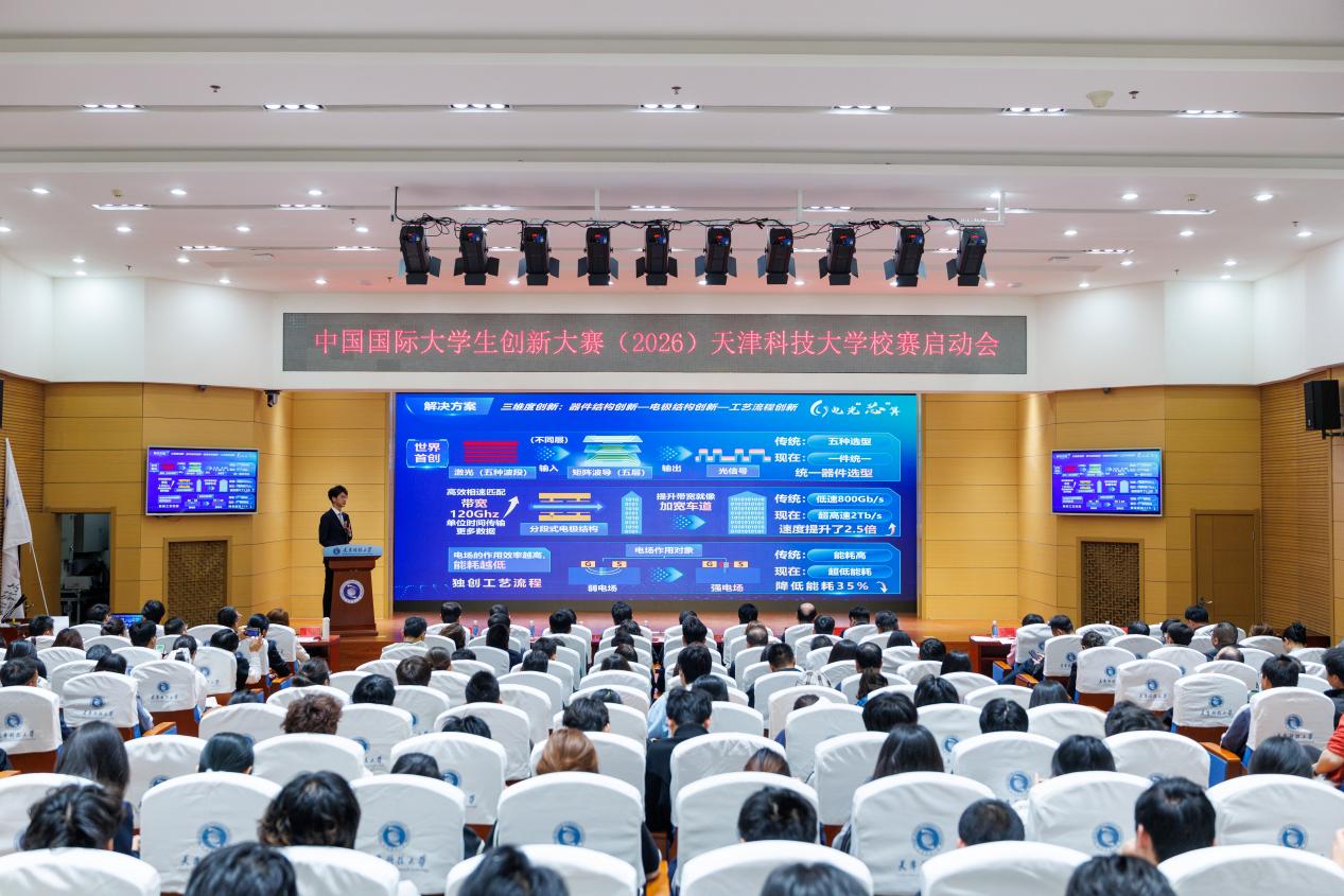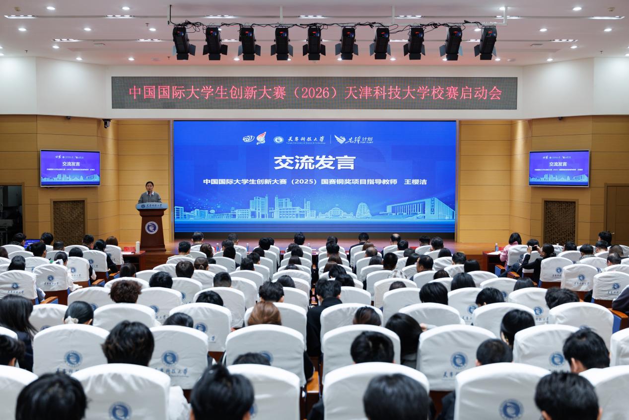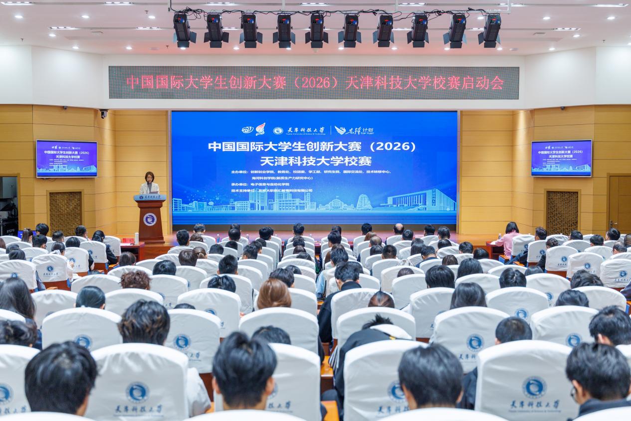 天津科技大学2026年中国国际大学生创新大赛校赛启动仪式在滨海中院逸夫楼报告厅举行。校党委常委、副校长高发明,创新创业学院、教务处、宣传部、人事处、财务处、校团委、学生处、研究生院、国际交流处、科技处、社科处、技术转移中心、海河科创学院(新质生产力研究中心)、校友与基金事务发展中心、学生就业指导中心相关负责同志,尚行学部及各学院师生代表参加了启动仪式。