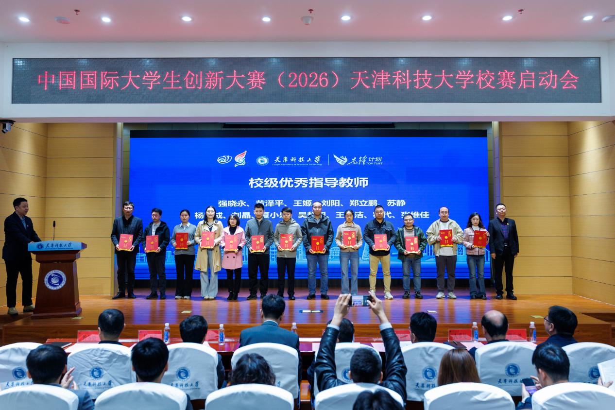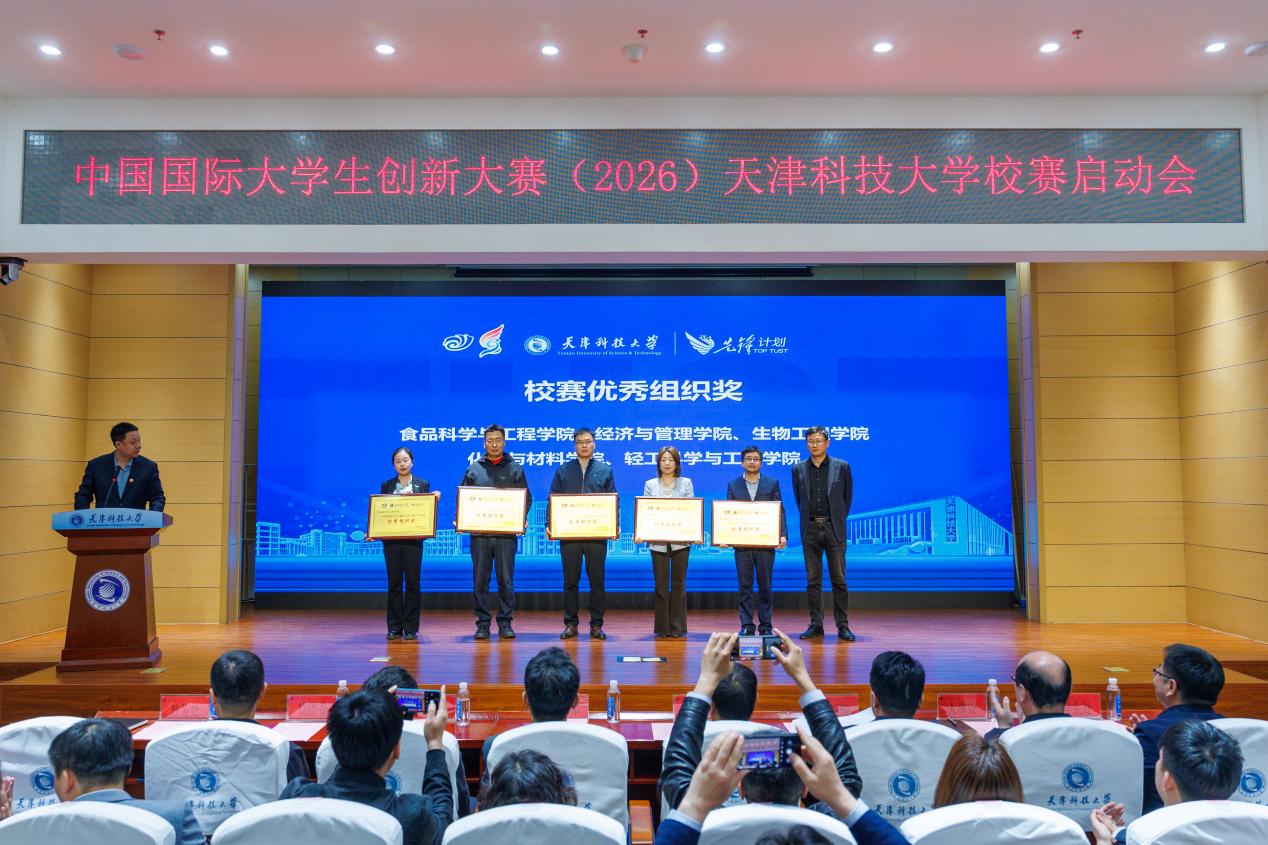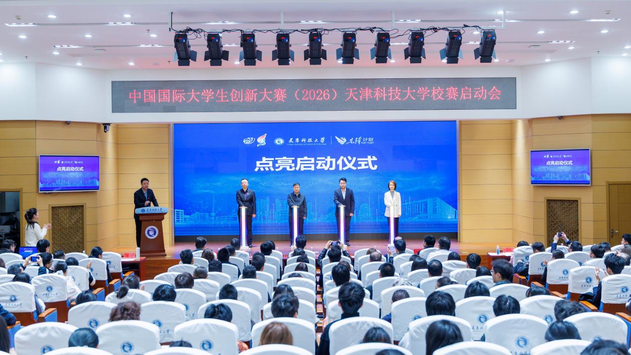 天津科技大学2026年中国国际大学生创新大赛校赛启动仪式在滨海中院逸夫楼报告厅举行。校党委常委、副校长高发明,创新创业学院、教务处、宣传部、人事处、财务处、校团委、学生处、研究生院、国际交流处、科技处、社科处、技术转移中心、海河科创学院(新质生产力研究中心)、校友与基金事务发展中心、学生就业指导中心相关负责同志,尚行学部及各学院师生代表参加了启动仪式。