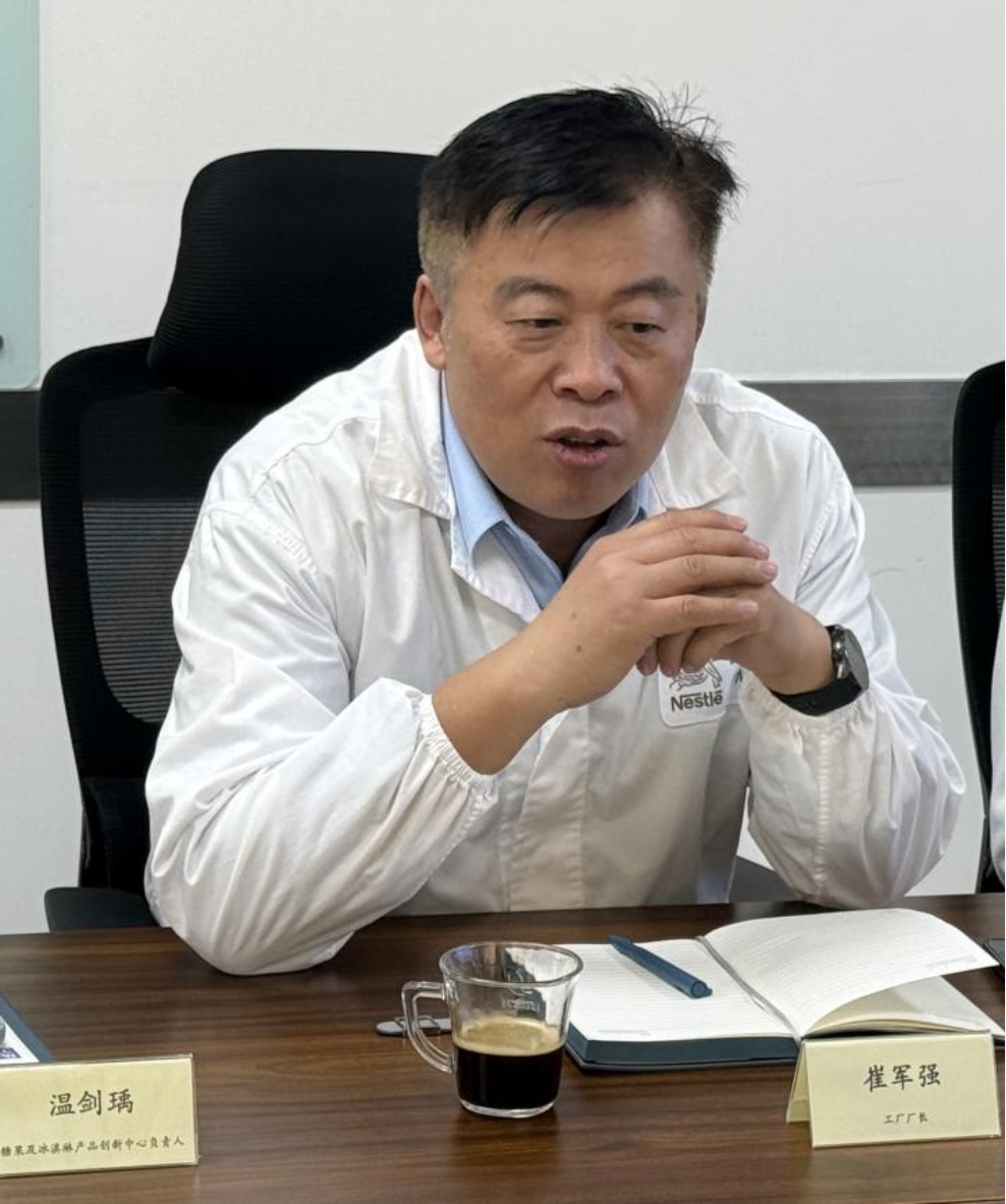 崔军强代表企业对学校一行的到来表示热烈欢迎。他详细介绍了雀巢公司的发展历程、全球业务布局以及天津工厂的生产运营情况,并指出天津雀巢自投产以来,始终致力于为消费者提供优质产品,涵盖威化、糖果、冰淇淋等品类。他感谢学校多年来为企业输送优秀人才,期待双方在科研攻关、人才培育、实习实践等方面深化合作,共同为食品行业高质量发展注入新动能。