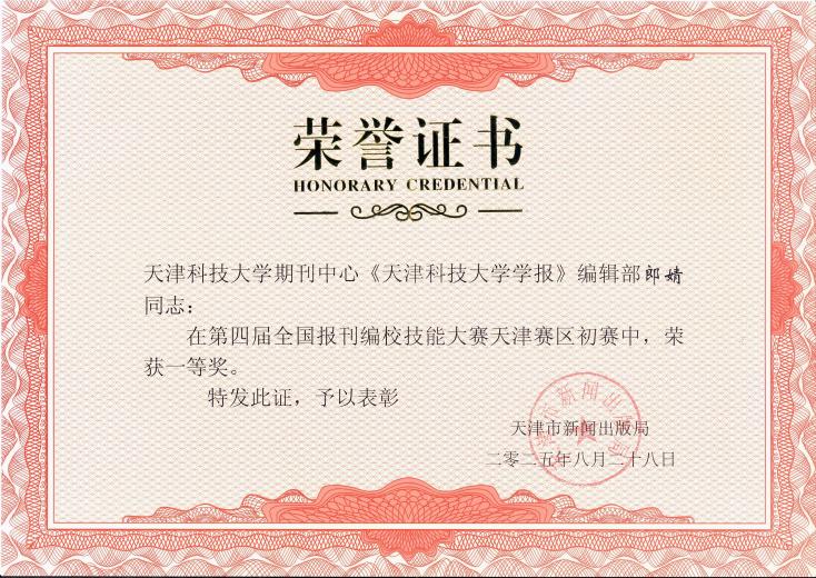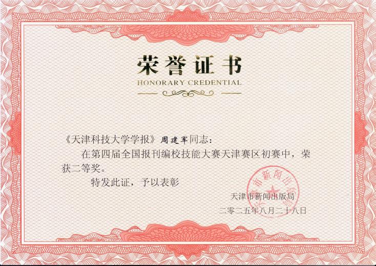 日前,第四届全国报刊编校技能大赛天津赛区比赛成绩揭晓。我校期刊中心郎婧、周建军分获一、二等奖,取得我校在该项赛事新的突破!这也是继2023年我校三位编辑荣获第三届全国报刊编校技能大赛(天津赛区)二等奖后,再获殊荣。