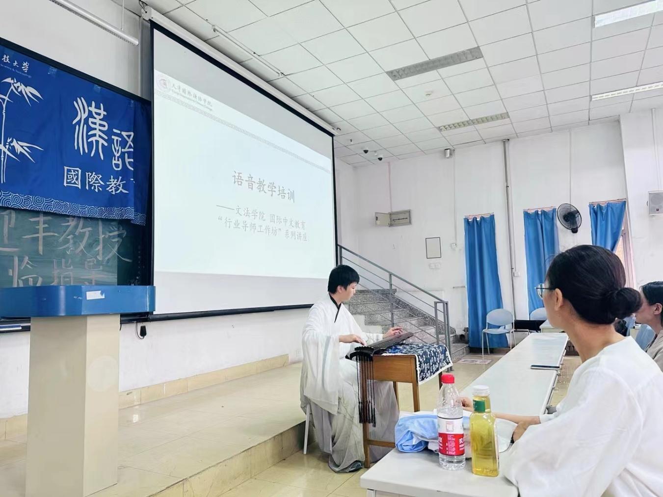 2024年5月16日下午,文法学院国际中文教育行业导师工作坊系列讲座第一场在泰达中院9-8阶梯教室顺利举行。本场讲座特邀南开大学比较语言学博士、天津国际汉语学院执行院长丰琨老师进行题名为“国际中文语音教学与提问技巧”的讲座。活动由文法学院汉语国际教育系主任赵林晓老师主持,副主任李子吟老师,教师代表刘昀老师出席活动,二百余名汉教专业本硕学生共同聆听此次讲座。讲座伊始,20级本科生张桓瑞现场弹奏古琴《仙翁操》,表达对同学们的欢迎。