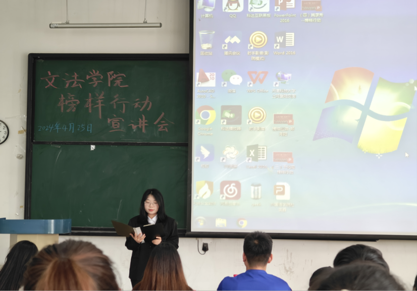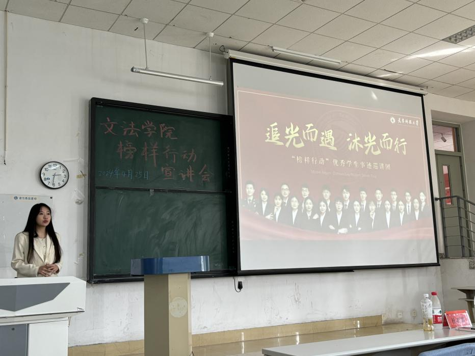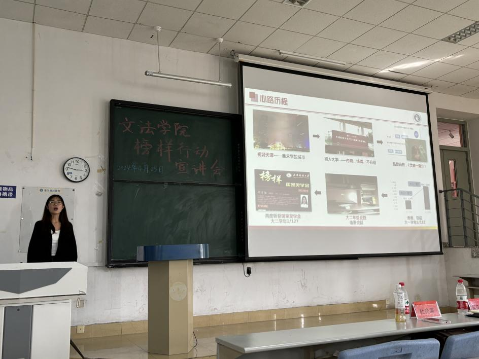为深入贯彻落实党的二十大精神,学习宣传贯彻习近平总书记视察天津重要讲话精神,全面落实学校"先锋计划",深化“思政铸魂”行动,充分发挥先进典型作用,持续讲好榜样故事。4月25日下午,我院在泰达校区中院图书馆第七阶梯教室开展“榜样行动”优秀学生事迹巡讲活动。活动由文法学院邀请到的榜样行动宣讲团的三位成员进行宣讲。