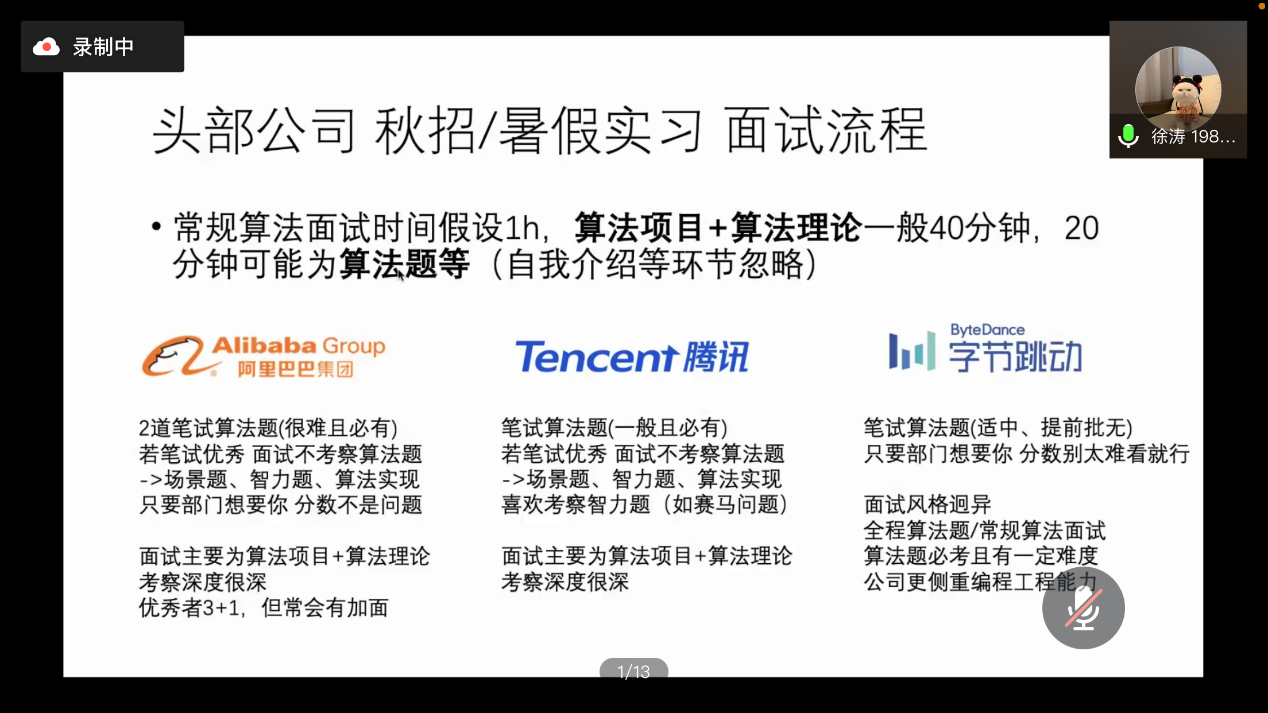 徐涛同学针对大厂算法岗到底需要准备哪些东西并结合自身经历展开了自己面试的经历。他从算法项目、算法理论、算法题目三个方面进行了讲解。他举例头部公司面试一小时中,算法项目与算法理论占约四十分钟,算法题目占约二十分钟,所以算法项目与算法理论十分重要,算法题目水平要达到基础水平。对于算法项目方面,他给出了没有算法项目的解决方法,我们需要将项目准备到什么程度以及如何做到更好。对于算法理论方面,他讲到基础理论一定要扎实、知识水平要有一定深度、一切算法项目中的理论更要知根知底。在算法题方面,一定要将自己的算法水平达到基础水平。在上述三个方面准备好后,有余力的同学可以在场景题、智力题、算法实现题等完善自己。最后,他为同学们介绍了算法岗的特点、分享了自己在选择工作中权衡工作与生活的感受。