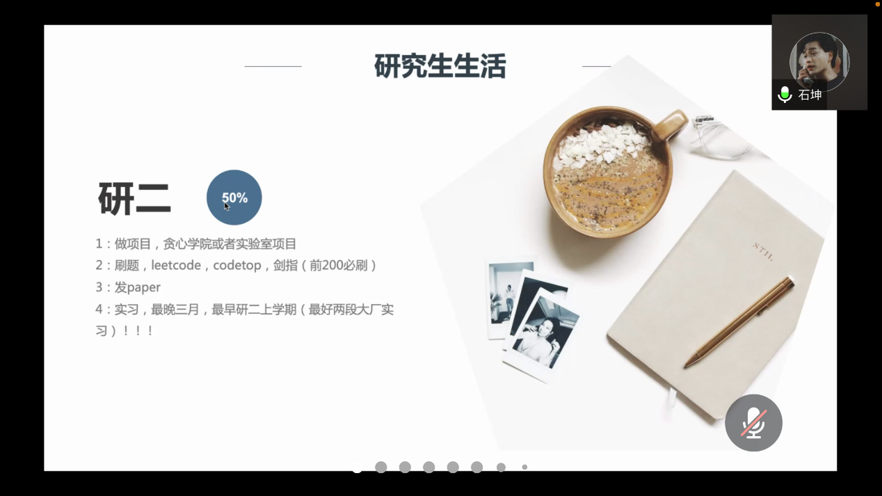 石坤同学针对研究生生活、面试经验、求职体会、问题与解答四个方面并结合自身经历进行了分享。首先,他强调研一时期要掌握基础知识并阅读一定数量的论文,研二时期要认真做项目、刷算法题、发出论文、出校实习,研三时期要积极参加秋招,自己的毕业论文与答辩也一定要重视。随后,他将自己的实习经历与面试经验分享给大家,并提示大家项目经验这项对面试很重要,刷算法题是一个面试的门槛是更重要的。最后,他为大家介绍了大厂工作氛围、工作强度、工作时间、薪资待遇与简历制作等。