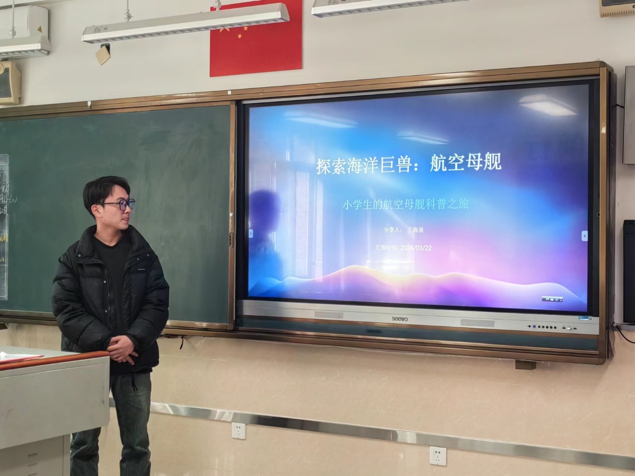 王海泉同学开篇用“什么是航母”的问题激发小学生的兴趣和想象力,带领他们开启航空母舰科普之旅。旅程的开头是航空母舰的历史与演变,随后他用通俗易懂的语言、图文并茂的方式解析了航空母舰从动力系统、舰载机类型、吨位大小的分类,并一一介绍了航空母舰从里到外、从功能到装备和日常,打开了同学们的眼界,满足了同学们的好奇心。海泉以航空母舰从技术革新、未来航母的设计理念以及作战模式的演变三个方面的未来展望作为旅程的尾声,在同学们心底埋下科技与军事的种子。他们被航空母舰的魅力吸引,并对在这个领域科技创新,保家卫国,尽自己一份力量表现出极大的兴趣。