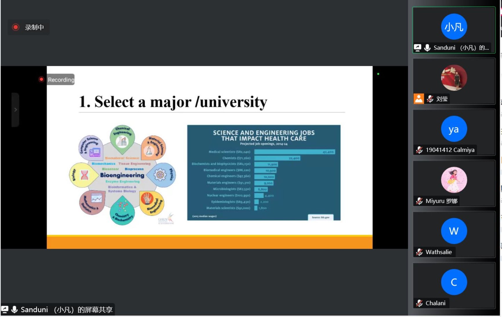 本期邀请生物工程学院斯里兰卡本科生DE ALWIS SOORIYA ARACHCHIGE SANDUNI SAMUDIKA (中文名:小凡)分享“如何在中国顶尖大学和研究所申请硕士项目”。报告以在线形式开展,生物工程学院2019级留学生本科班参加,同时向全学院本科生开放。国际化教研室副主任刘莹老师主持会议。