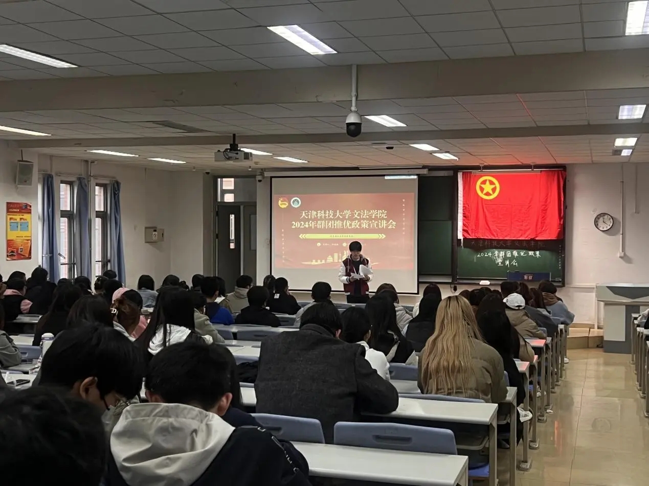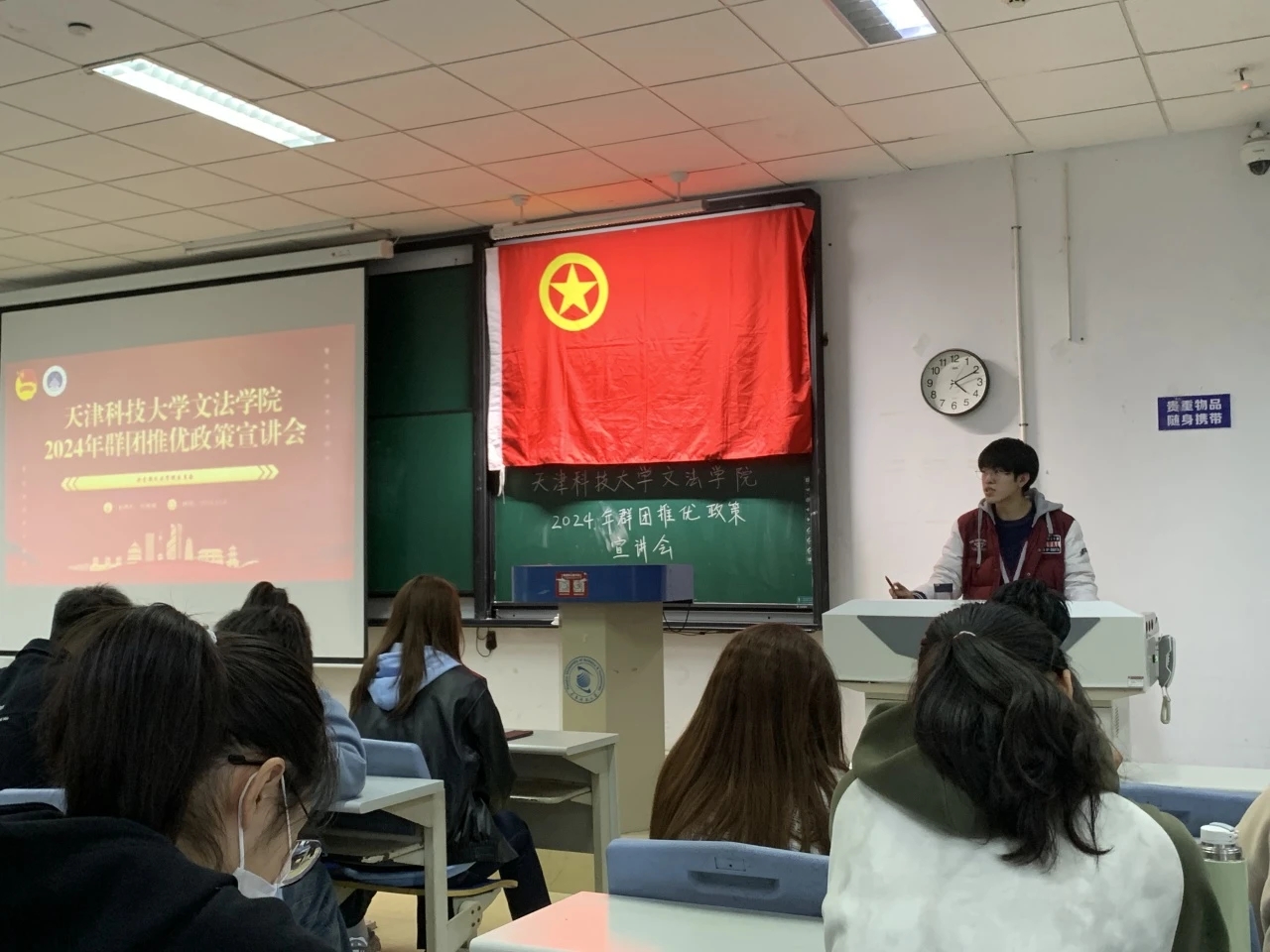 为深入学习贯彻习近平新时代中国特色社会主义思想和党的二十大精神,落实习近平总书记关于青年工作的重要思想以及《天津科技大学关于加快推进高质量内涵发展的意见》(简称“先锋计划”)的相关要求,文法学院团委于3月14日在滨海校区图书馆举办了2024年上半年群团推优政策宣讲会。本次会议由团委副书记刘桂银主持,各年级班委以及团员青年参会。