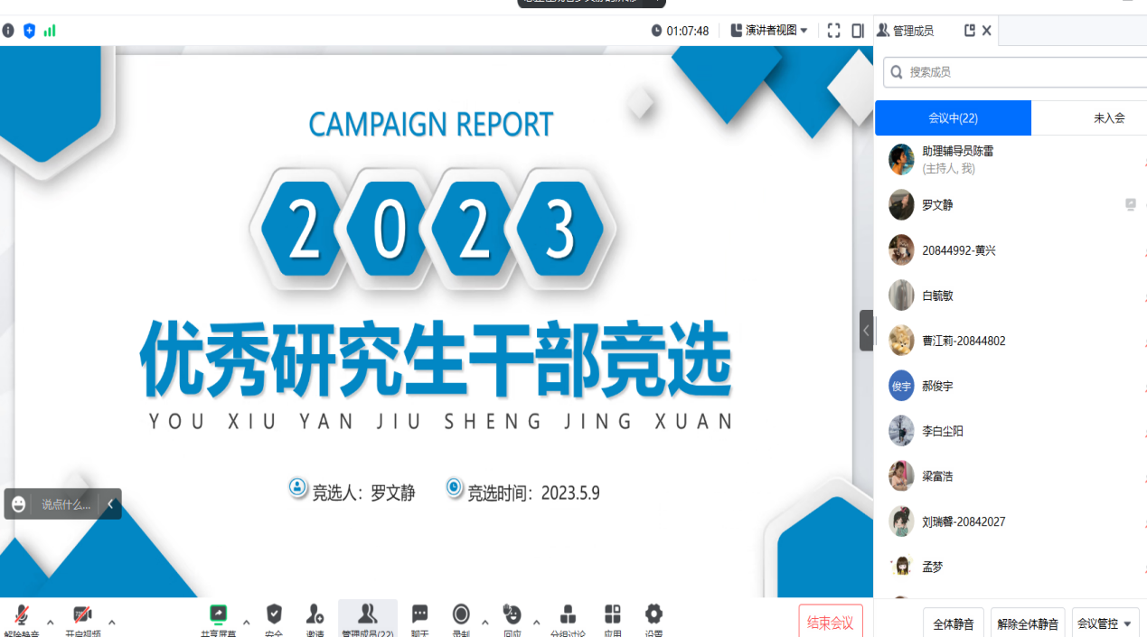为深入贯彻落实党的二十大精神,落实立德树人根本任务,进一步在全体研究生中树典型、推推进,营造创优争先的良好学术氛围。食品科学与工程学院于2023年5月9日以腾讯会议形式分四场召开优秀研究生、优秀研究生干部竞评大会,竞评会由学院党委委员代表、导师代表、辅导员代表和学生代表担任评委。