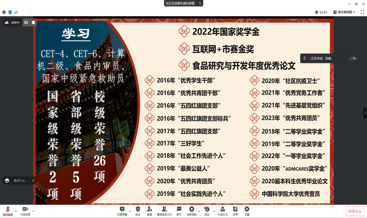 通过此次评选,不仅展示了食品学子在科研、志愿服务等方面取得的成果,而且通过发挥榜样的示范引领作用,激发学院全体研究生坚定信念,树立奋发向上、团结进取、求真务实、开拓创新的精神,努力成长为担当民族复兴大任的时代新人。