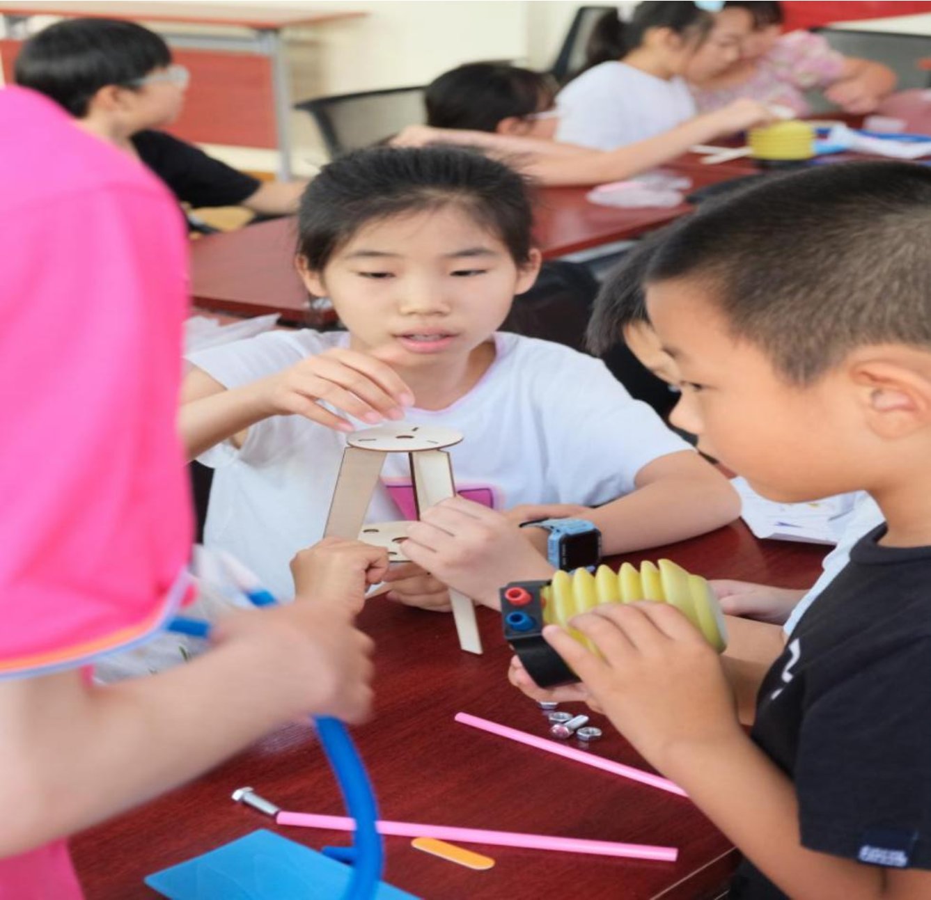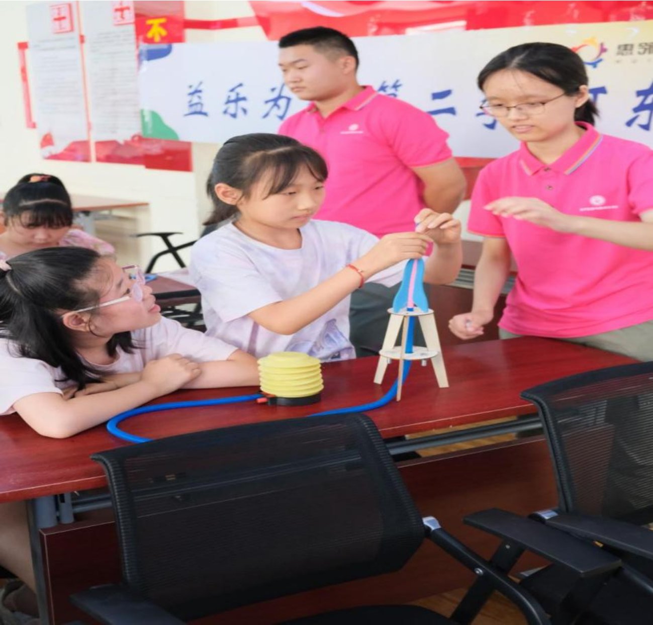 实验环节中,团队成员指导孩子们制作小火箭,激发了大家的学习热情和兴趣。小朋友们尽显心灵手巧,粘贴机翼、拼接发射底座、安装承重螺丝、连接增压管和气囊,将机翼、底座、动力部分组装,一系列程序下来,一架架小飞机在一声声欢呼雀跃中成功起飞,一同起飞的还有孩子们投身祖国科技事业的梦想。
