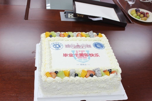 最后,大家共同品尝校友办准备的十周年蛋糕,气氛热烈轻松,其乐融融。至此,本次座谈会圆满落幕,在校友的精心组织和学校周到安排下,聚会活动精彩而热烈,校友们乘兴而来,满意而归,都深深感受到了母校家一般的温暖,纷纷表达了支持母校建设和再回母校聚会的心愿,以及希望学校和学院越来越好的真挚祝福。