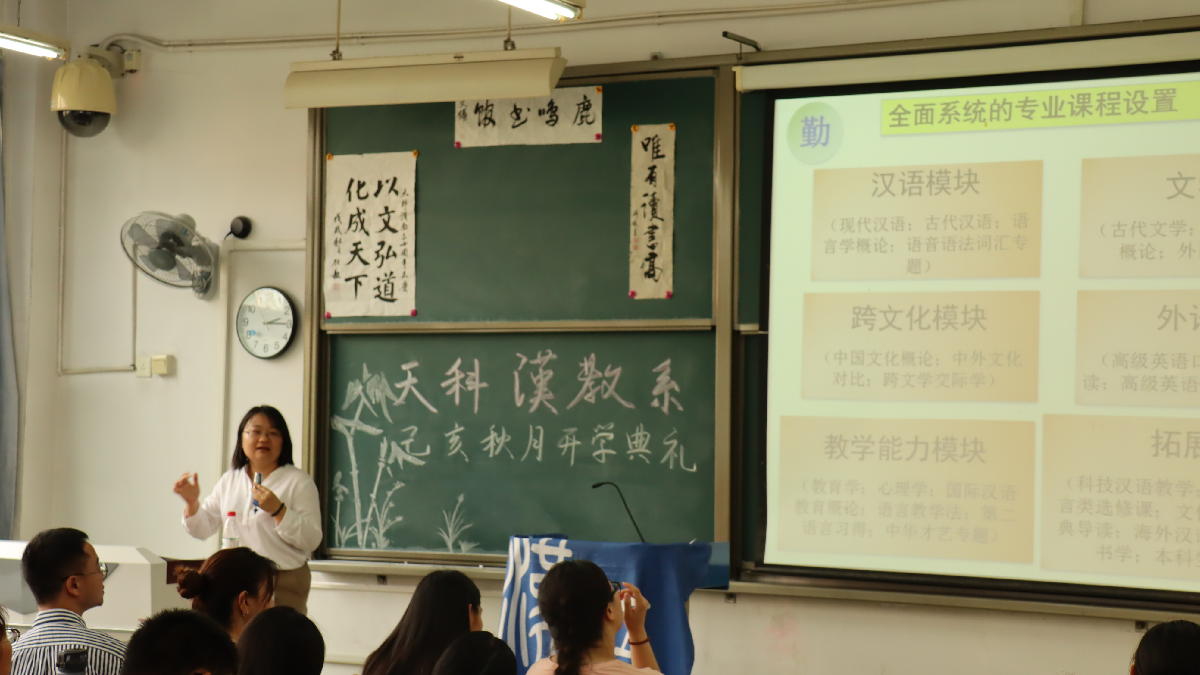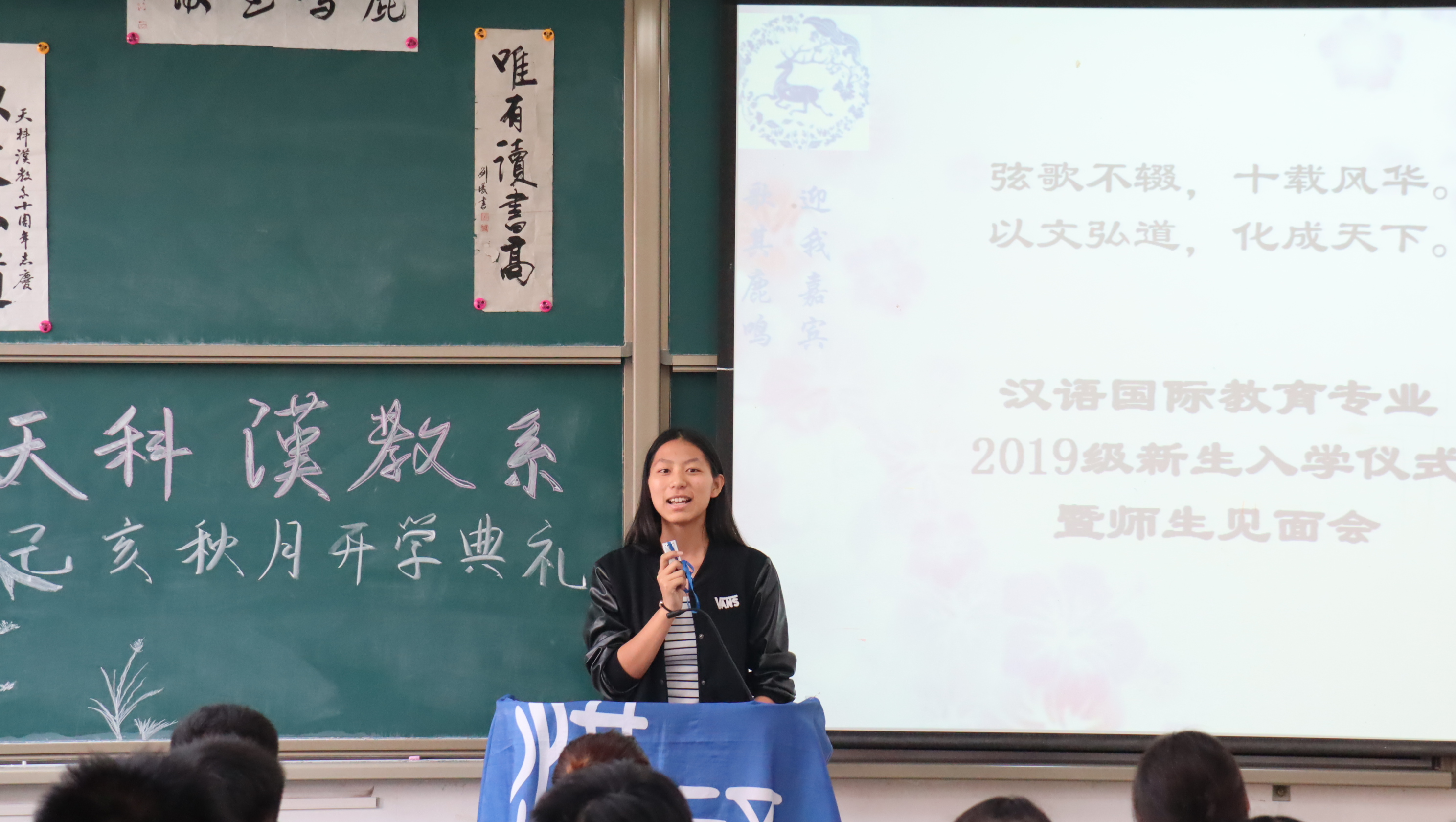 9月27日下午,我校文法学院汉语国际教育2019级六十余名学生于三号楼321教室举办“己亥秋鹿鸣开学典礼”。典礼现场在樊潇、崔欣宇、马晓宇、朱财政等志愿者的精心布置下,充满了汉教系特有的人文气息。系主任赵林晓、专业课老师何国锦出席典礼活动。