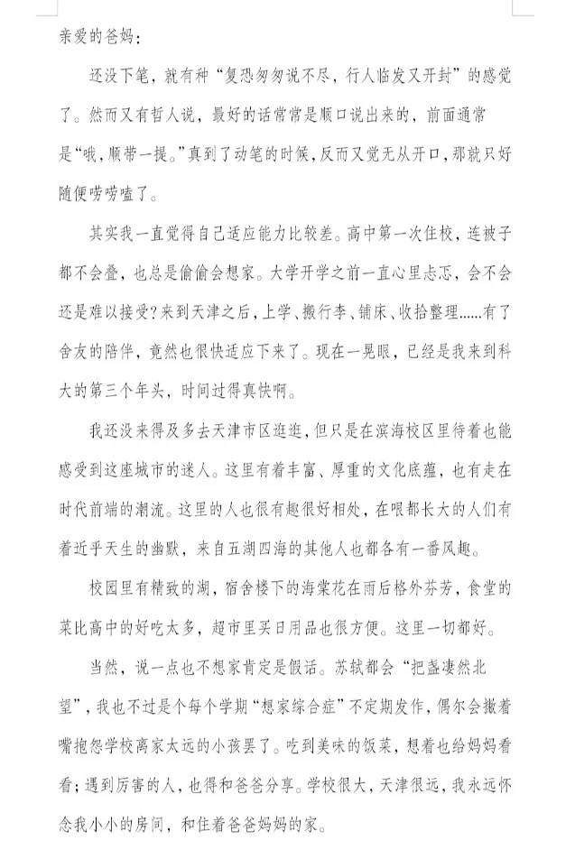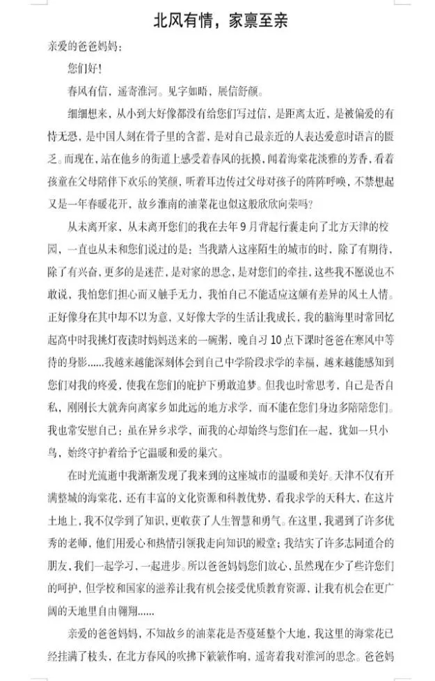 4月20日,该活动圆满结束。同学们表示家书活动给同学们提供了一个向家人表达爱的机会,帮助他们感受到了家人特别的陪伴,感受到了家庭的温暖和支持。家书或轻或重,执笔写下的是内心的声音,家书让爱和温情在文字间流淌,让家的力量永远陪伴同学们成长。