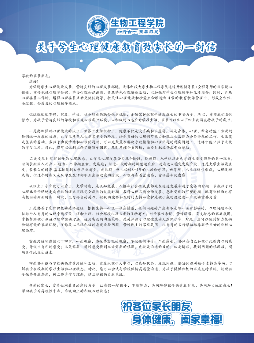 自新生报到起,生物工程学院党委统筹部署,面向新生及新生家长下发《关于学生心理健康教育致家长的一封信》、组织开展怦然“新”动新生天科初印象、组织学生观看秋季学期心理健康教育“开学第一课”、组织开展新生系列教育活动,在我校大学生心理健康中心的指导下,依托学院心理工作站,关注学生成长,为学生及时纾困,开展好心理育人的工作。